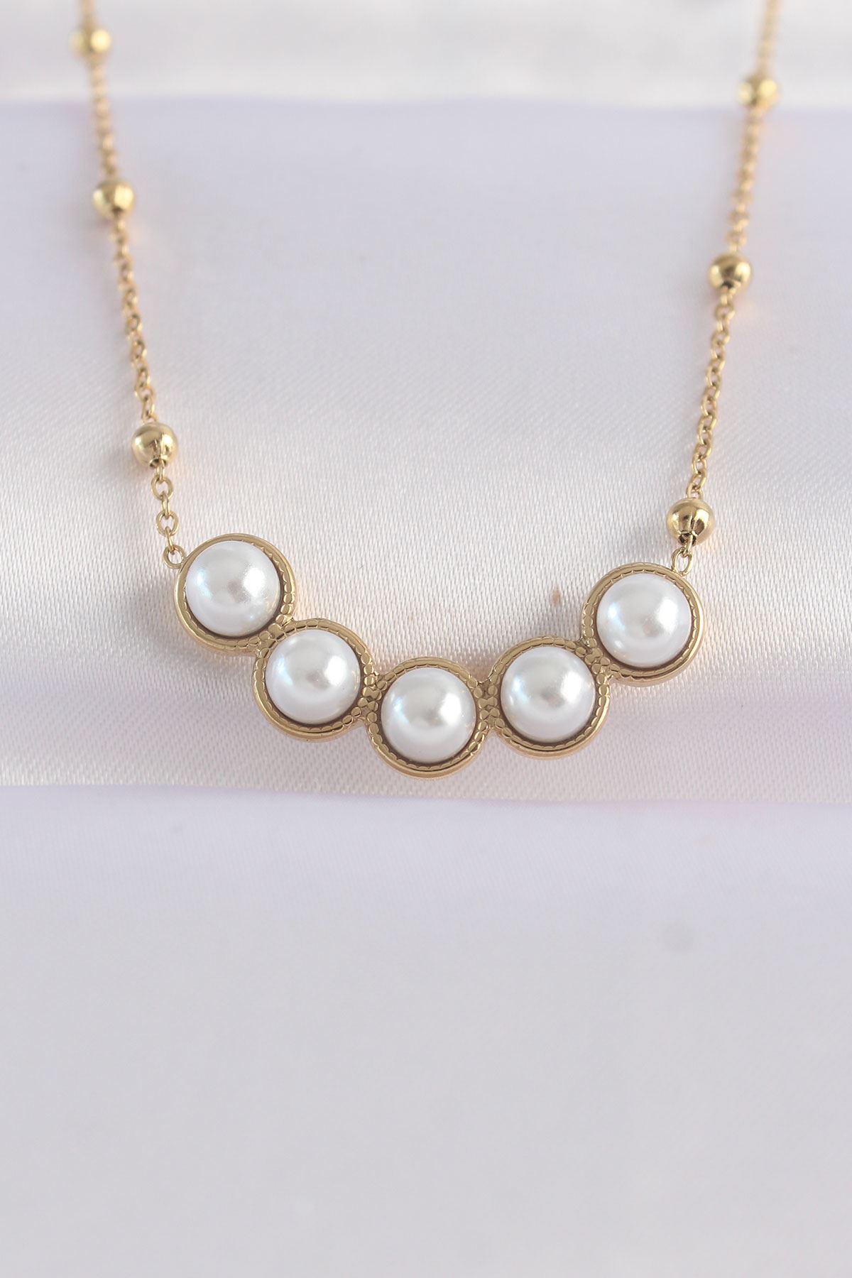 YRTCL 316L Çelik Zincir Altın Renk Sıralı İnci Taşlı Kolye