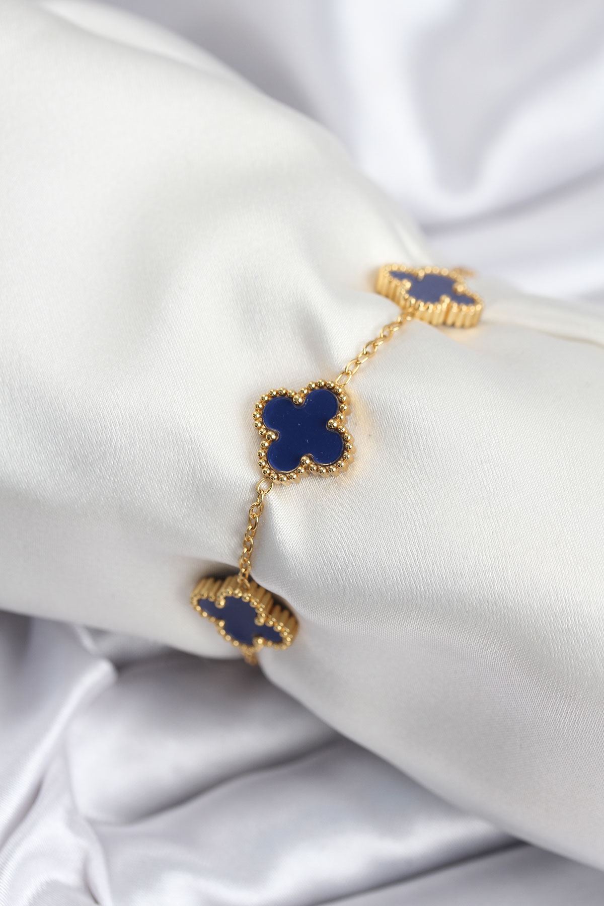 YRTCL 316L Çelik Zincir Gold Renk Lacivert Yonca Kadın Bileklik