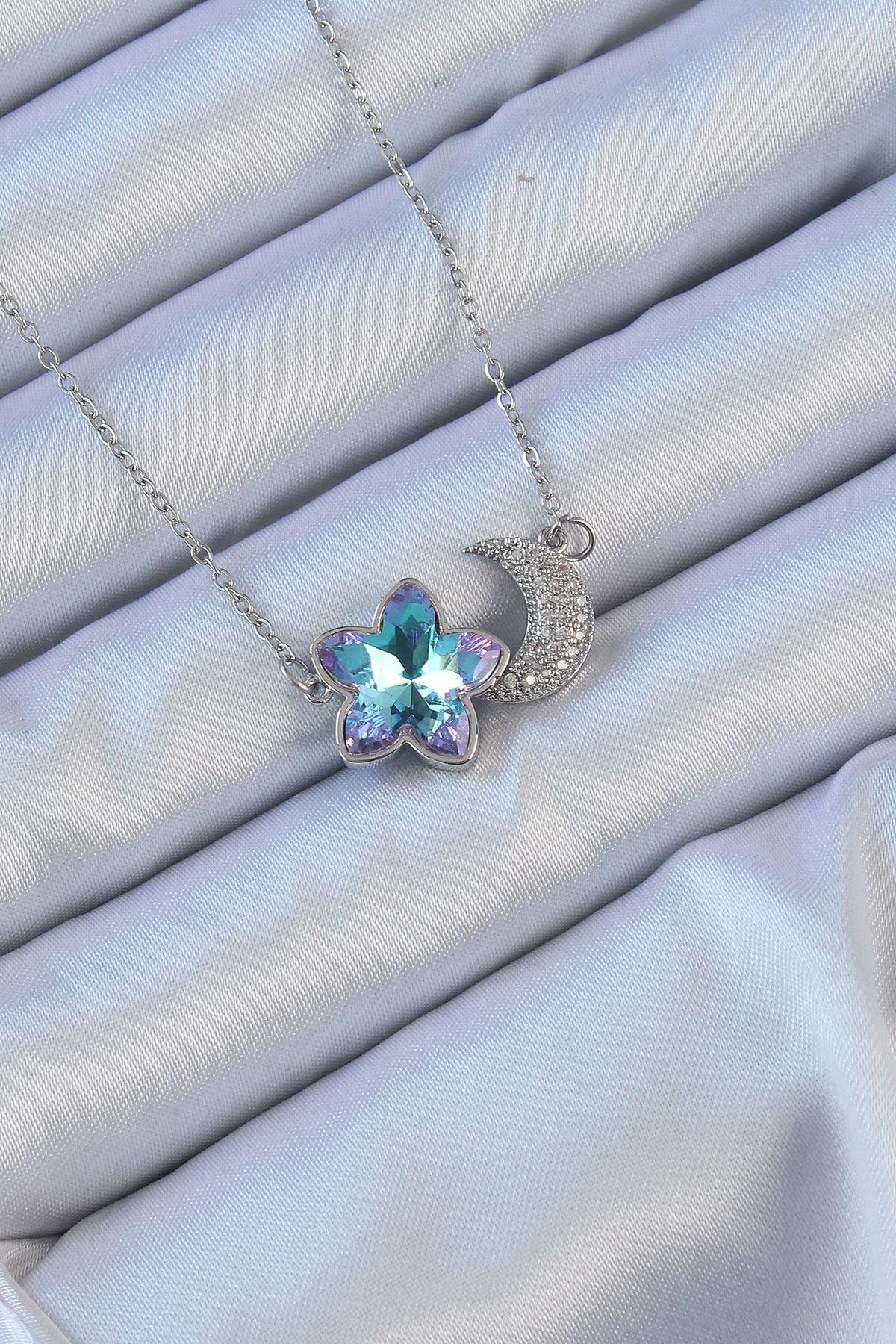 YRTCL 316L Çelik Zincir Gümüş Renk Ay Tasarımlı Renkli Zirkon Taşlı Çiçek Kolye