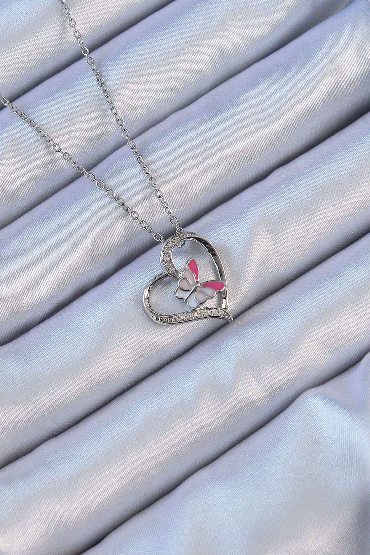 YRTCL 316L Çelik Zincir Gümüş Renk Mineli Kelebek Figür Zirkon Taşlı Kalp Kolye