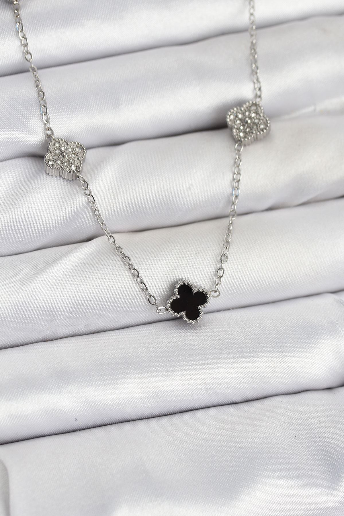 YRTCL 316L Çelik Zincir Gümüş Renk Siyah ve Zirkon Taşlı Baby Boy Yonca Kadın Kolye