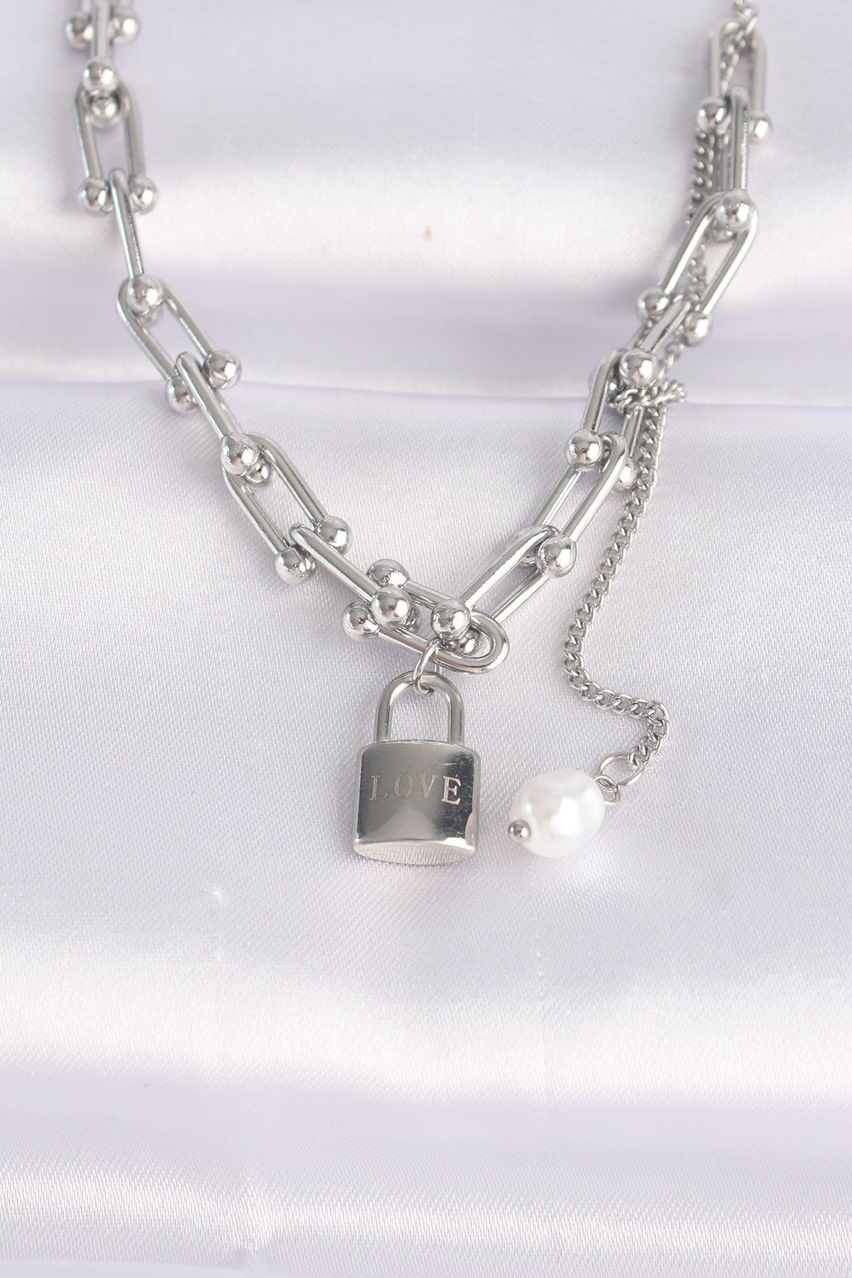 YRTCL 316L Çelik Zincir Gümüş Renk Zincirli Love Yazılı Kilit Kolye