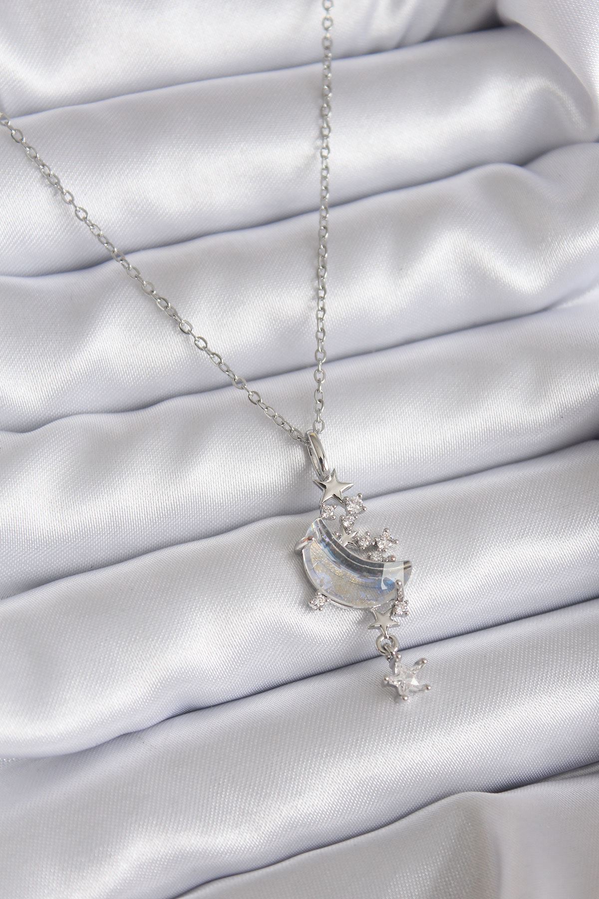 YRTCL 316L Çelik Zincir Gümüş Renk Zirkon Taşlı Ay Model Sallantı Yıldız Detay Kadın Kolye