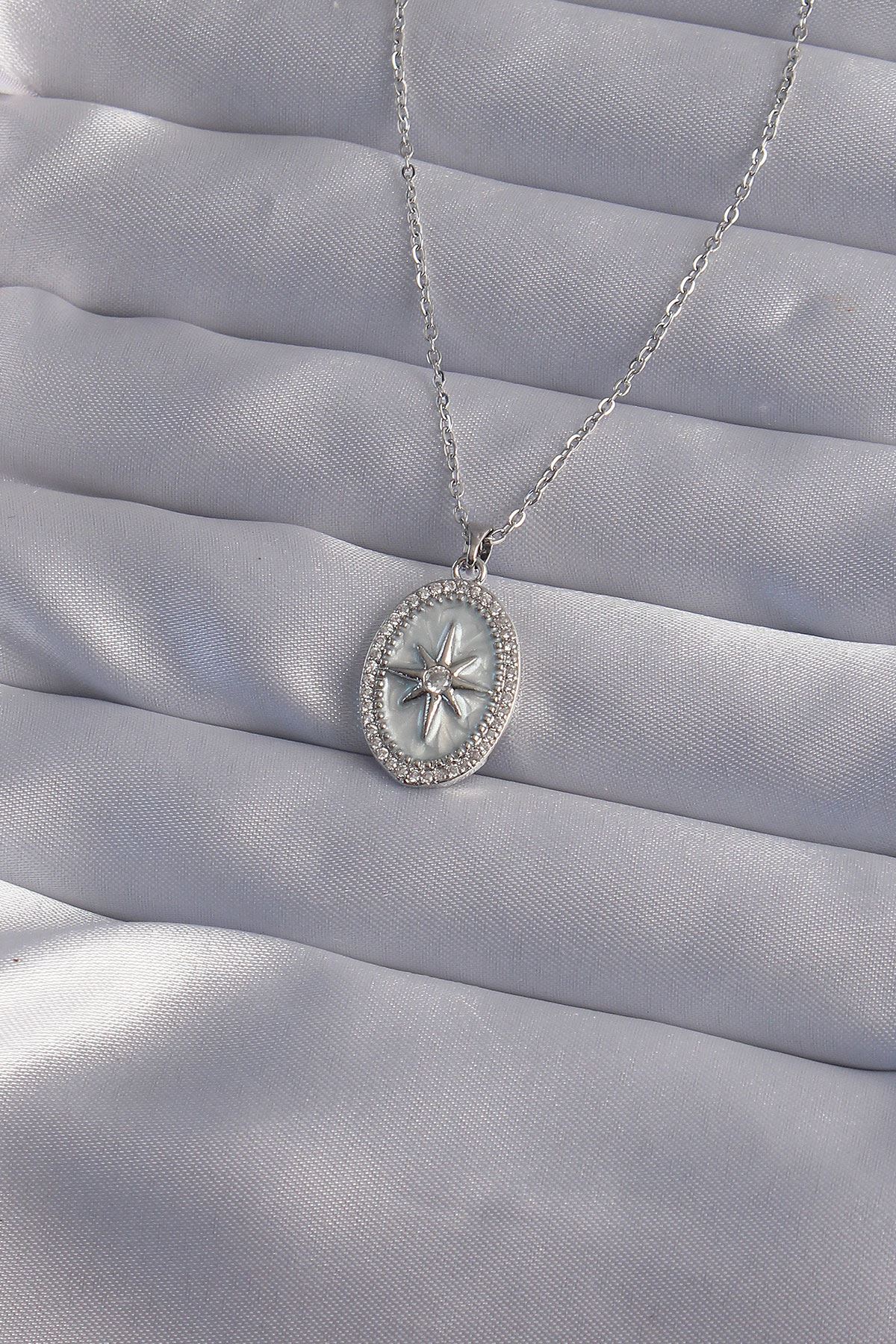 YRTCL 316L Çelik Zincir Gümüş Renk Zirkon Taşlı Kabartmalı Kutup Yıldızı Kolye