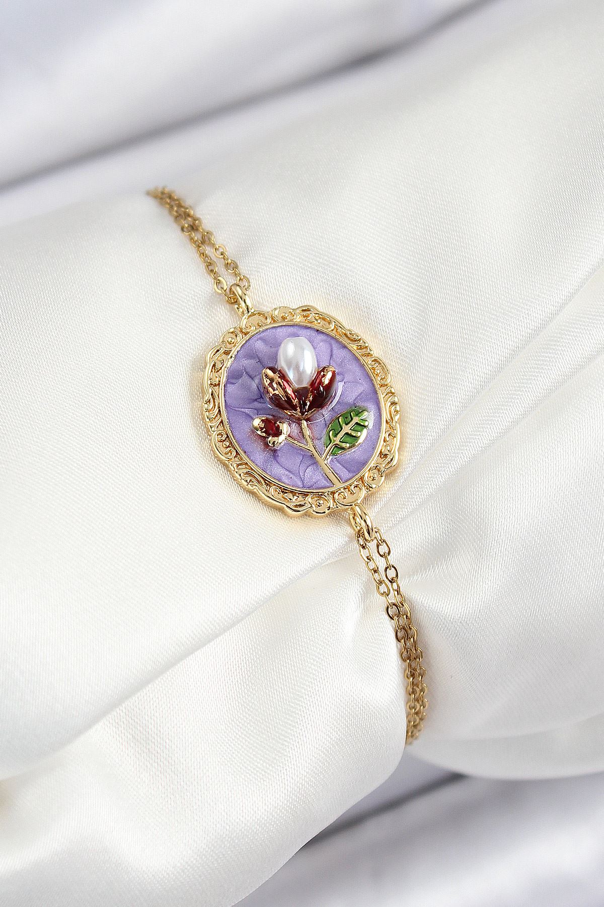YRTCL 316L Çelik Zincir Mor Mineli Sanatsal Portre İnci Detaylı Lale Model Gold Renk Kadın Bileklik