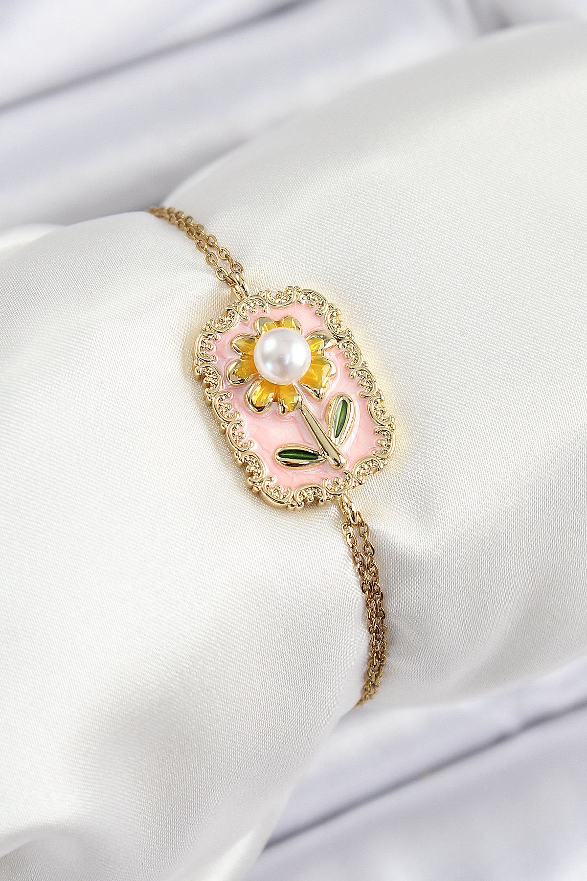 YRTCL 316L Çelik Zincir Pembe Mineli Sanatsal Portre İnci Detaylı Papatya Model Gold Renk Kadın Bileklik