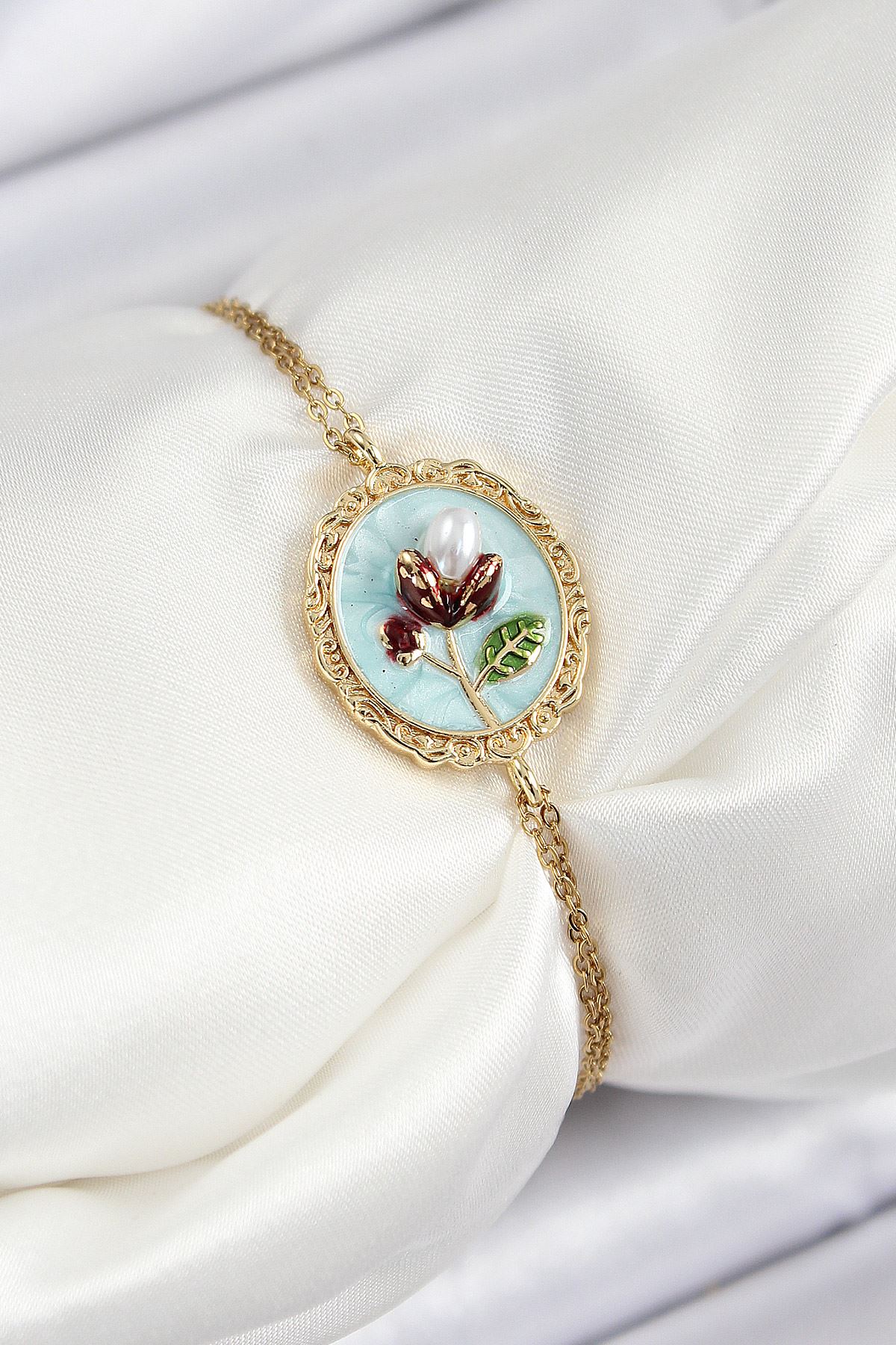 YRTCL 316L Çelik Zincir Turkuaz Mineli Sanatsal Portre İnci Detaylı Lale Model Gold Renk Kadın Bileklik