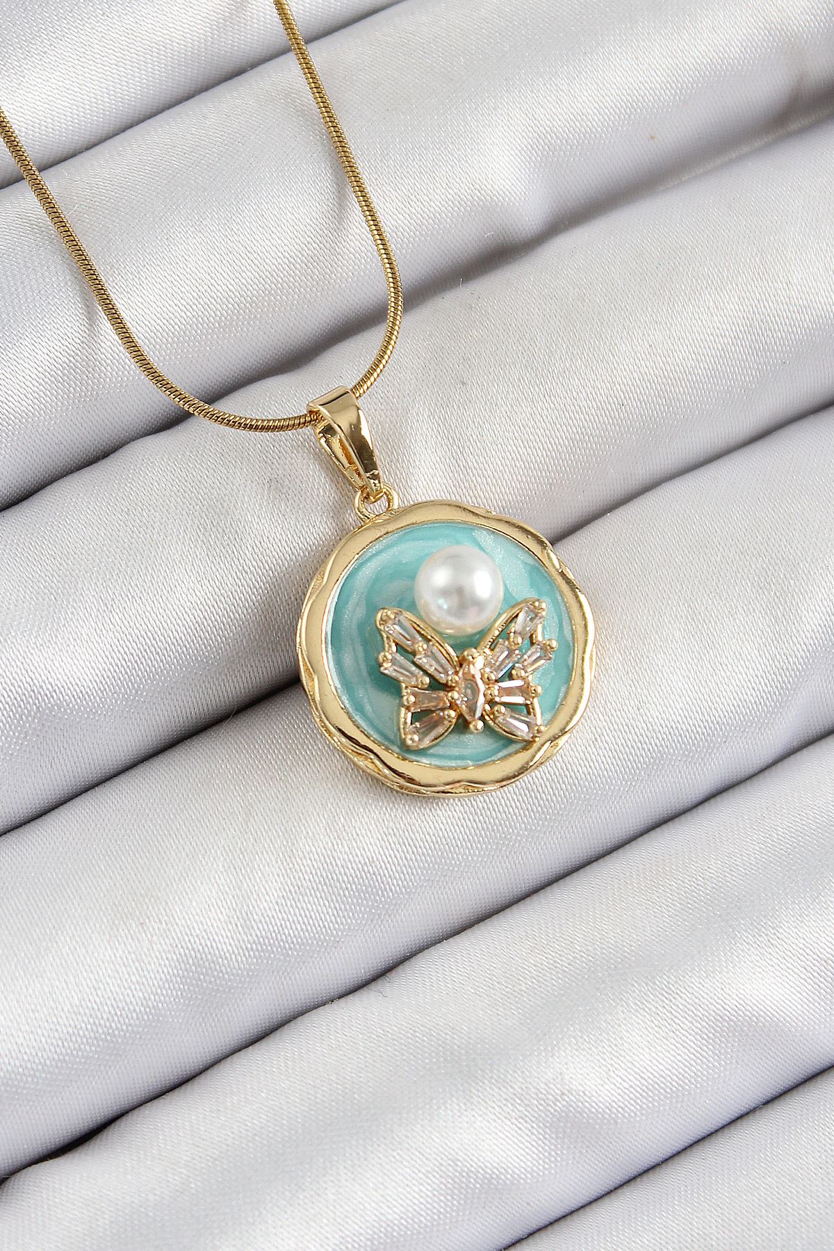 YRTCL 316L Çelik Zincir Zirkon Taşlı Turkuaz Sanatsal Portre İnci Detaylı Kelebek Model Gold Renk Kadın Kolye