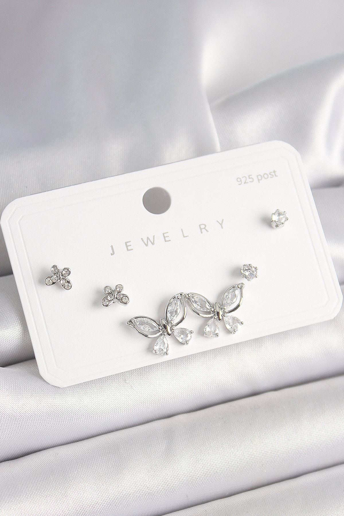 YRTCL 925 Ayar Gümüş Çivi Pirinç Gümüş Renk Zirkon Taşlı Kelebek Model Kadın Küpe Seti
