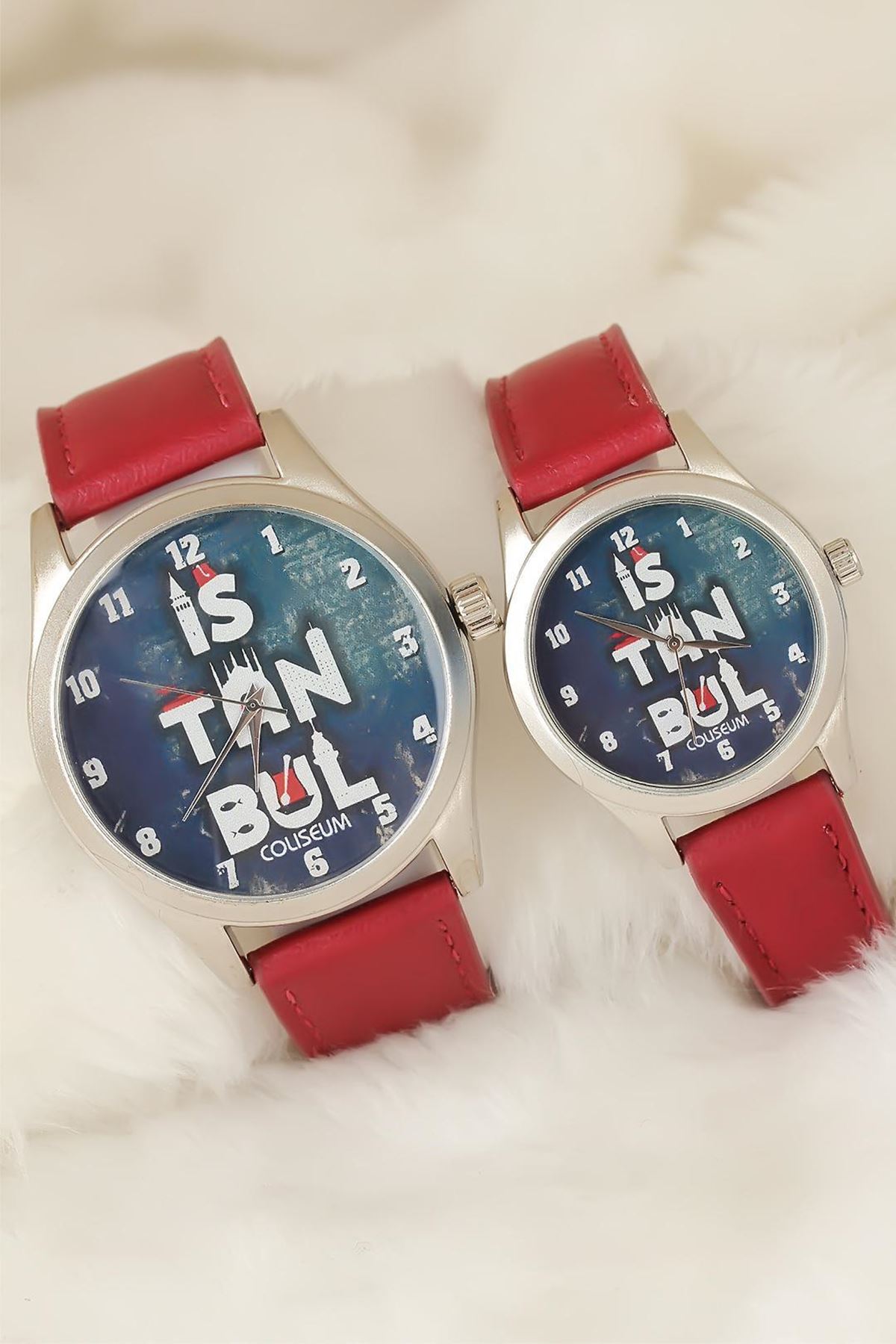YRTCL Bordo Renk Deri Kordonlu İstanbul Tasarımlı Sevgili Saatleri
