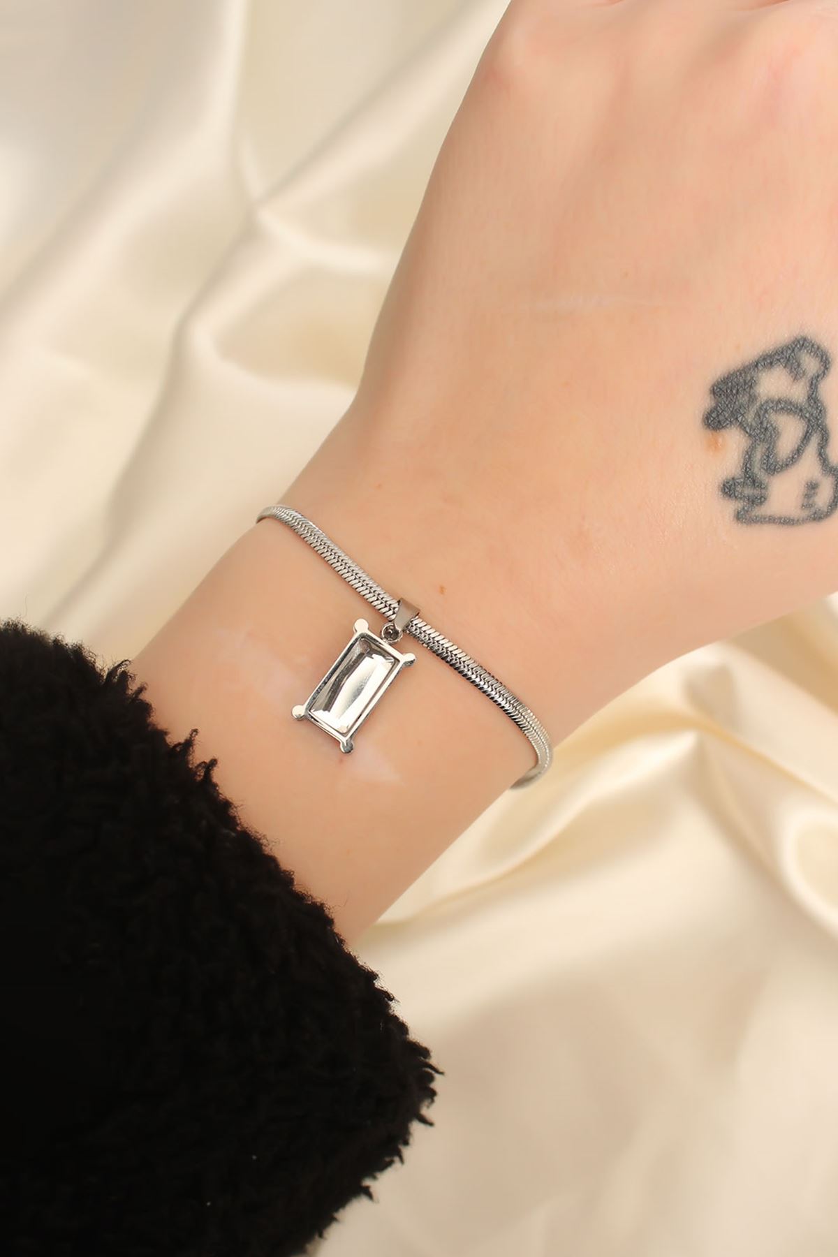 YRTCL Çelik Gümüş Renk Dikdörtgen Taşlı İtalyan Zincirli Bileklik
