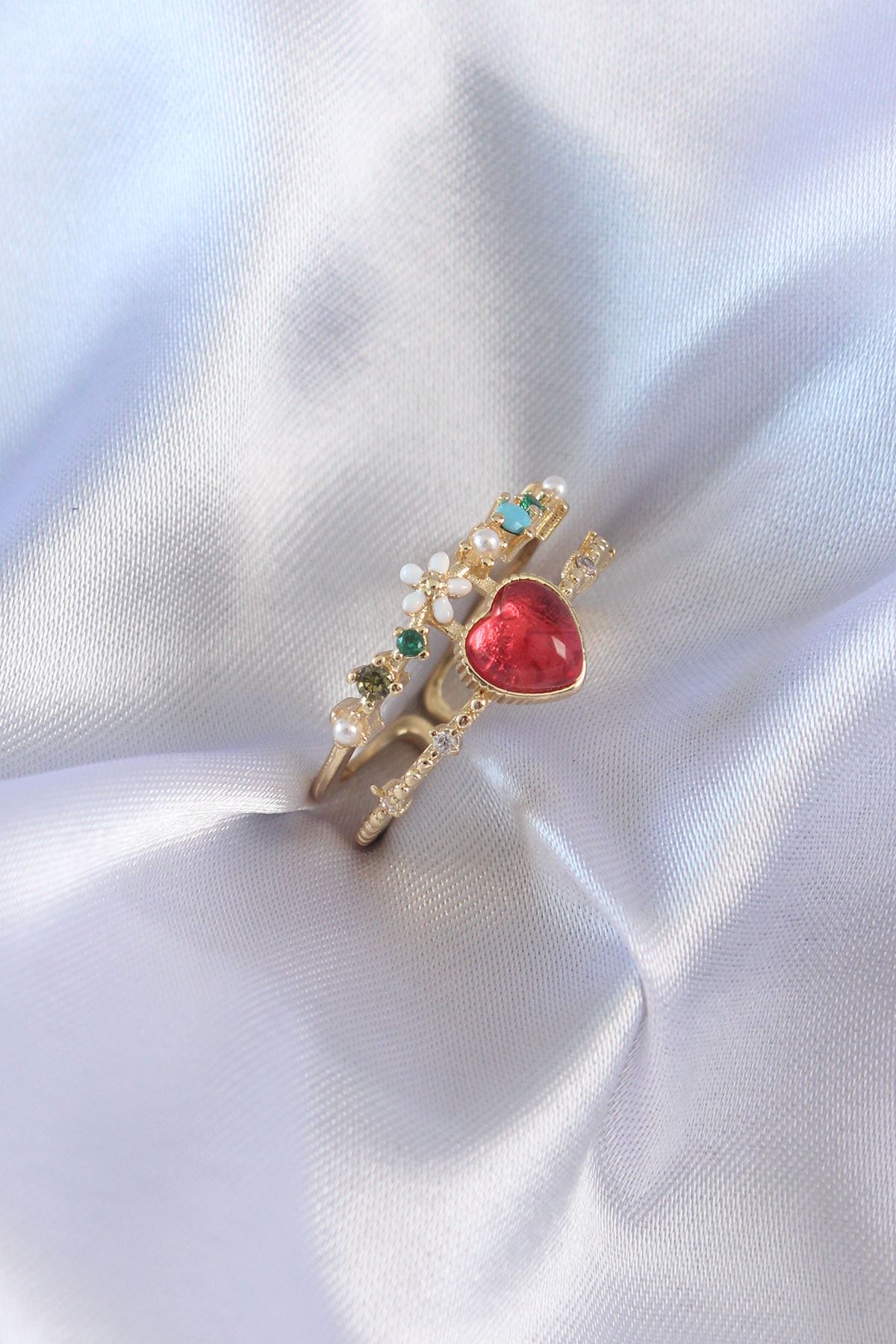 YRTCL Gold Renk Kırmızı Zirkon Taş Kalp Model Pirinç Kadın Yüzük