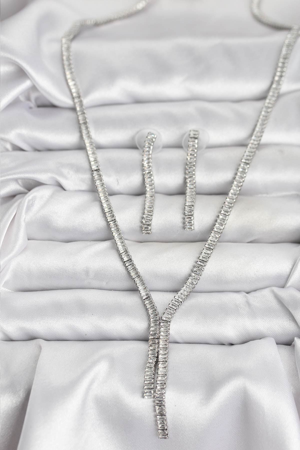 YRTCL Gümüş Renk Baget Zirkon Taşlı Kadın Kolye Küpe Set