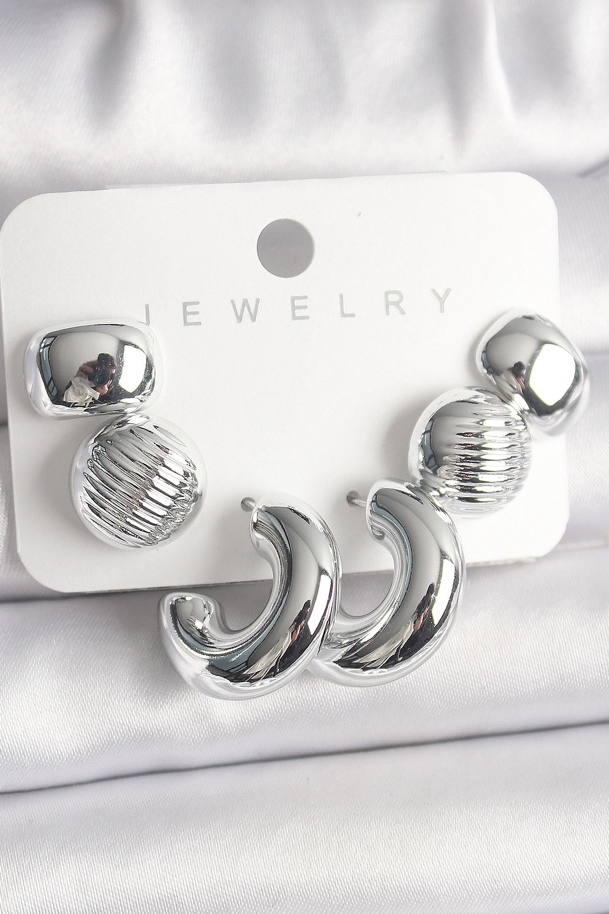 YRTCL Gümüş Renk İşlemeli Daire Halka Model CCB Platik Kadın Küpe Seti