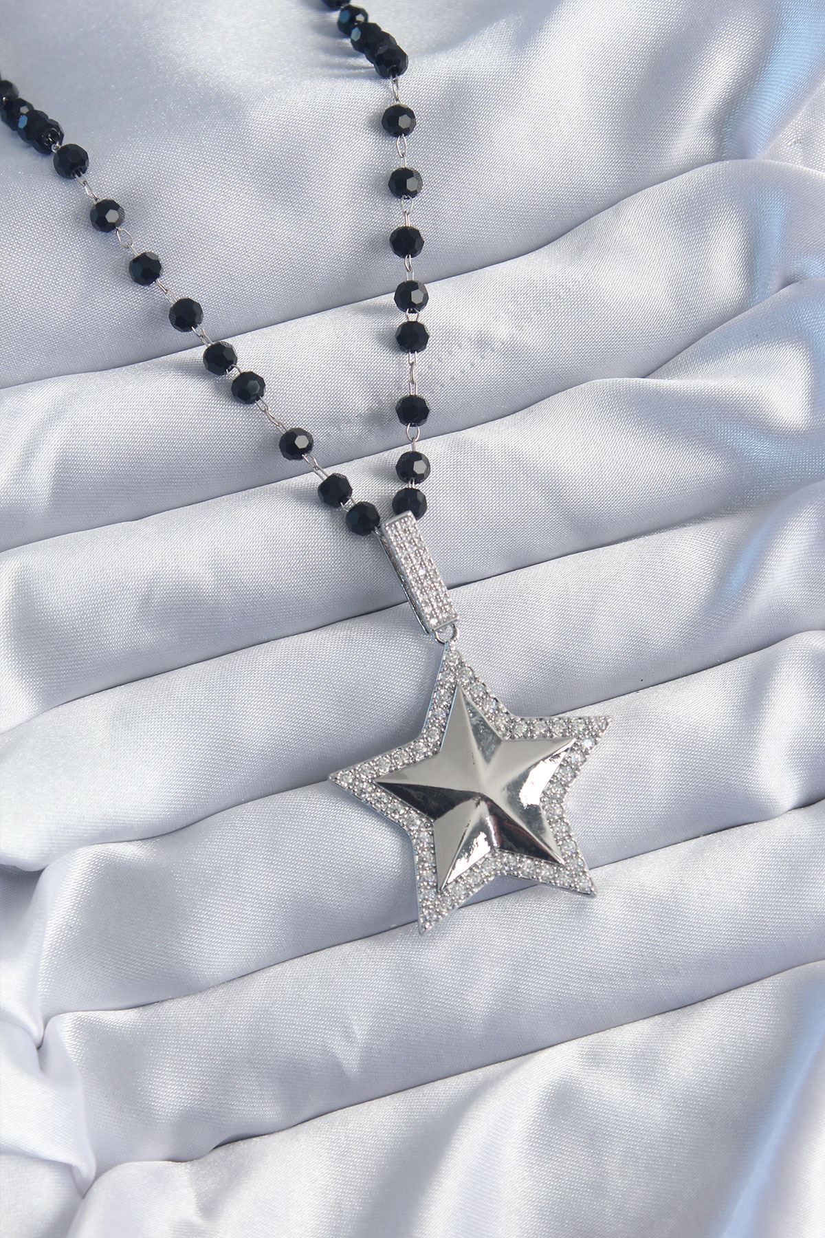 YRTCL Gümüş Renk Siyah Boncuk Zirkon Taşlı Pirinç Yıldız Model VİP Seri Kadın Kolye