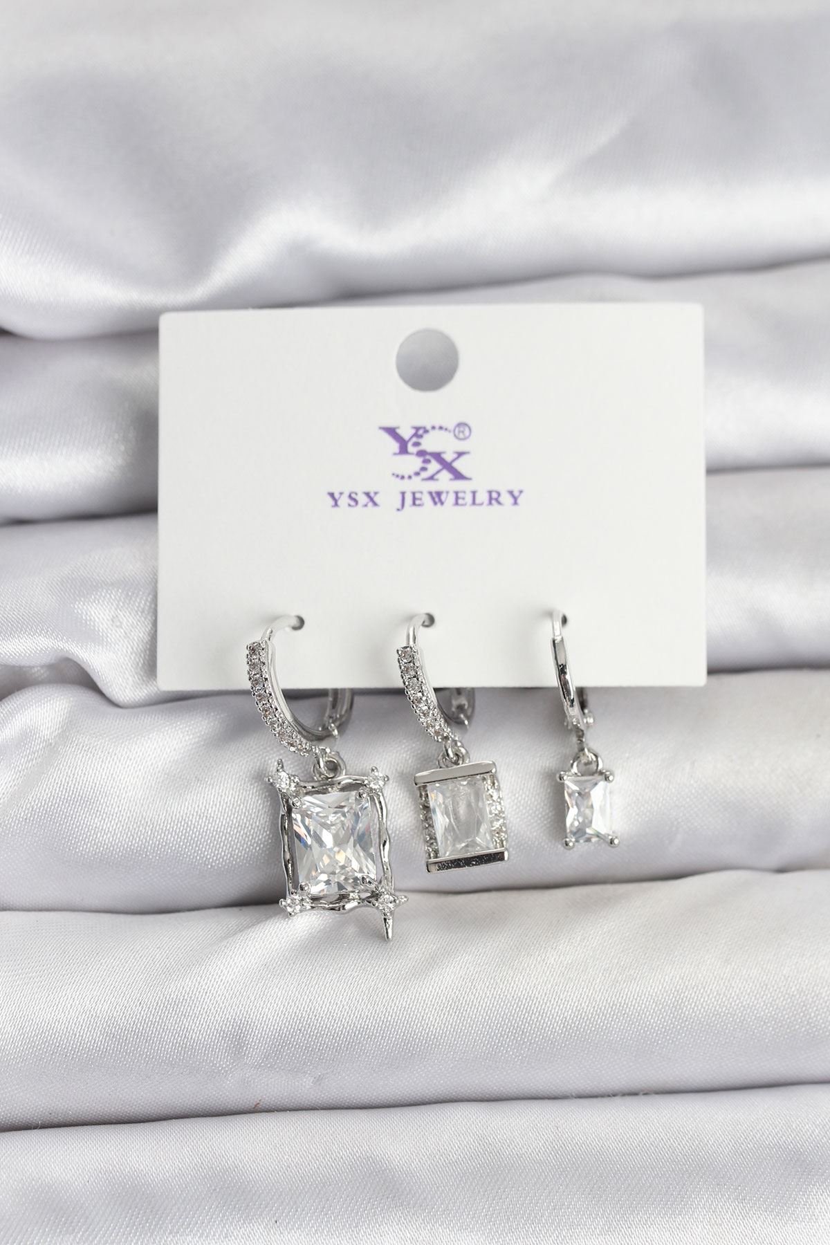 YRTCL Pirinç Halka Figürlü Zirkon Taşlı Gümüş Renk 3'lü Kıkırdak Kadın Küpe Set