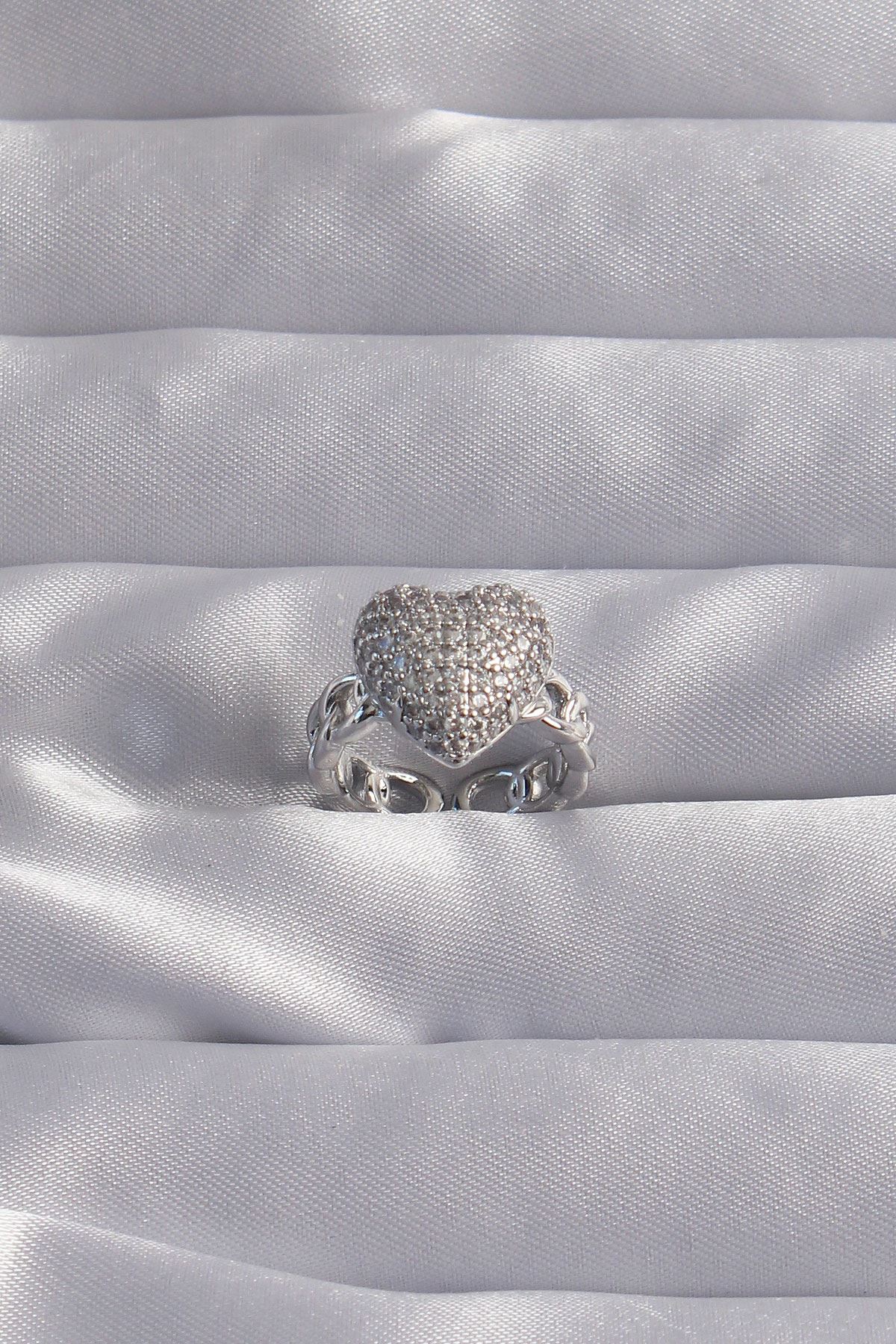 YRTCL Pirinç Ayarlamalı Gümüş Renk Zirkon Taşlı Bombeli Kalp Yüzük