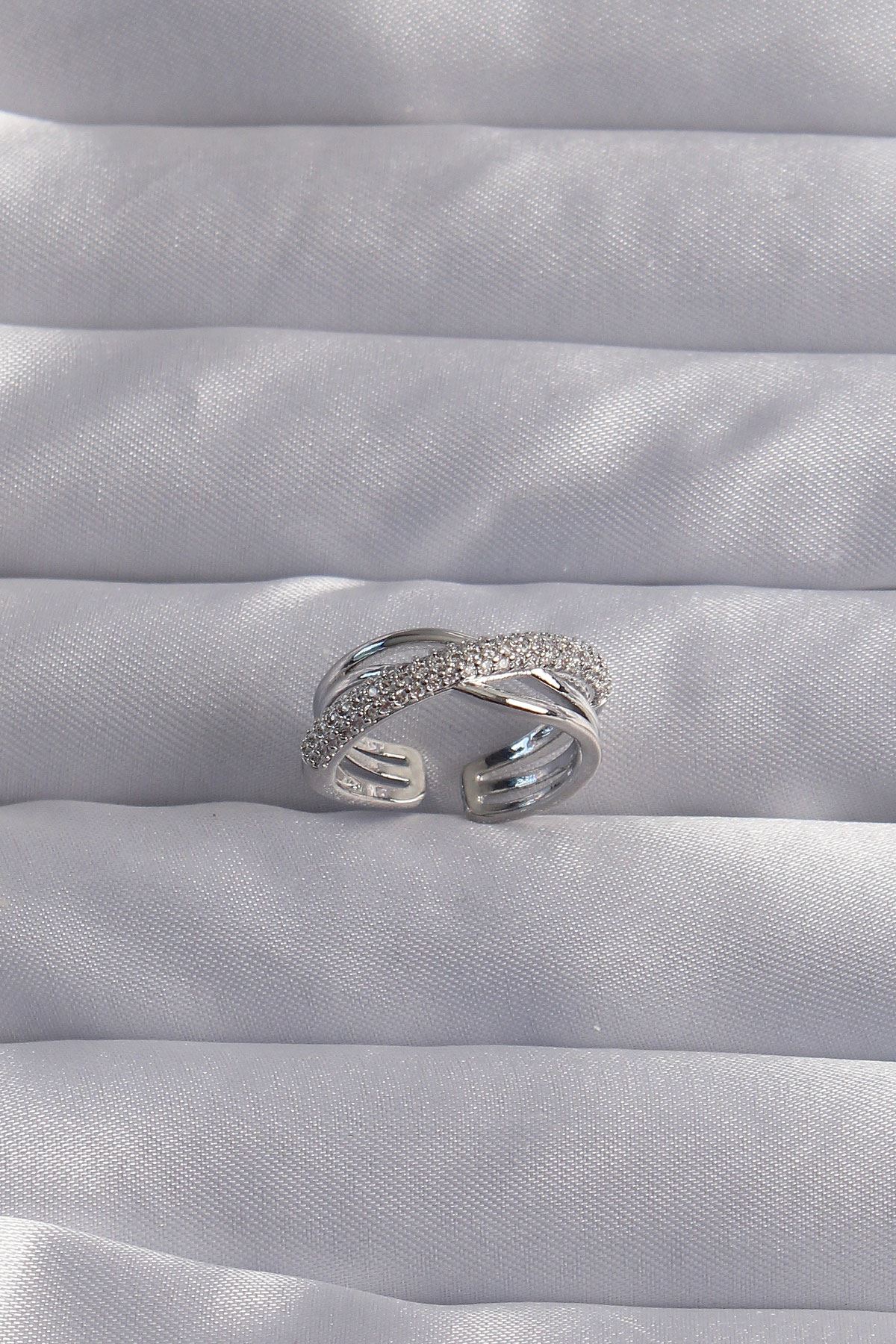 YRTCL Pirinç Ayarlamalı Gümüş Renk Zirkon Taşlı Çapraz Görünüm Yüzük