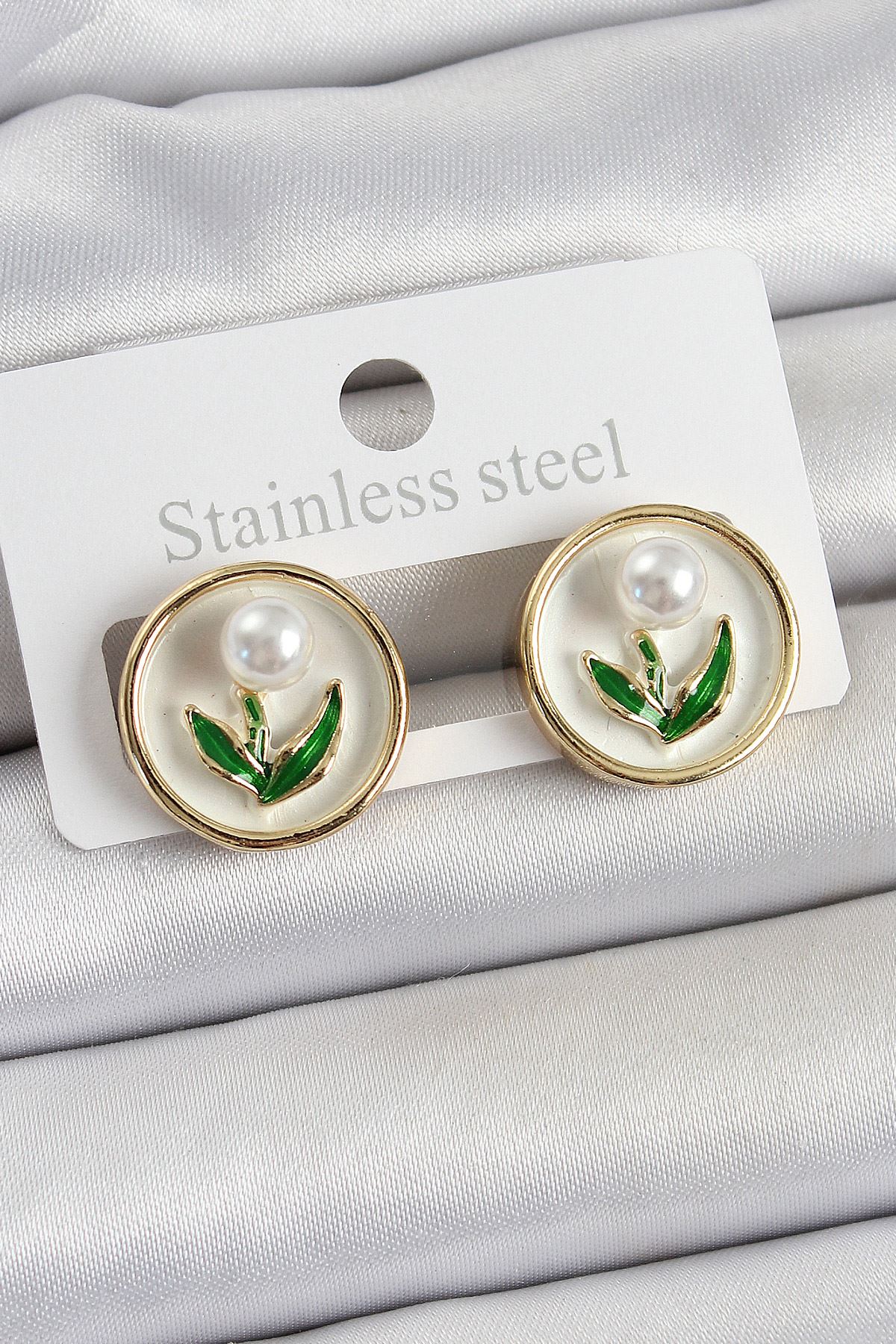 YRTCL Pirinç Beyaz Mineli Lale Figürlü Sanatsal Portre Model Gold Renk Kadın Küpe