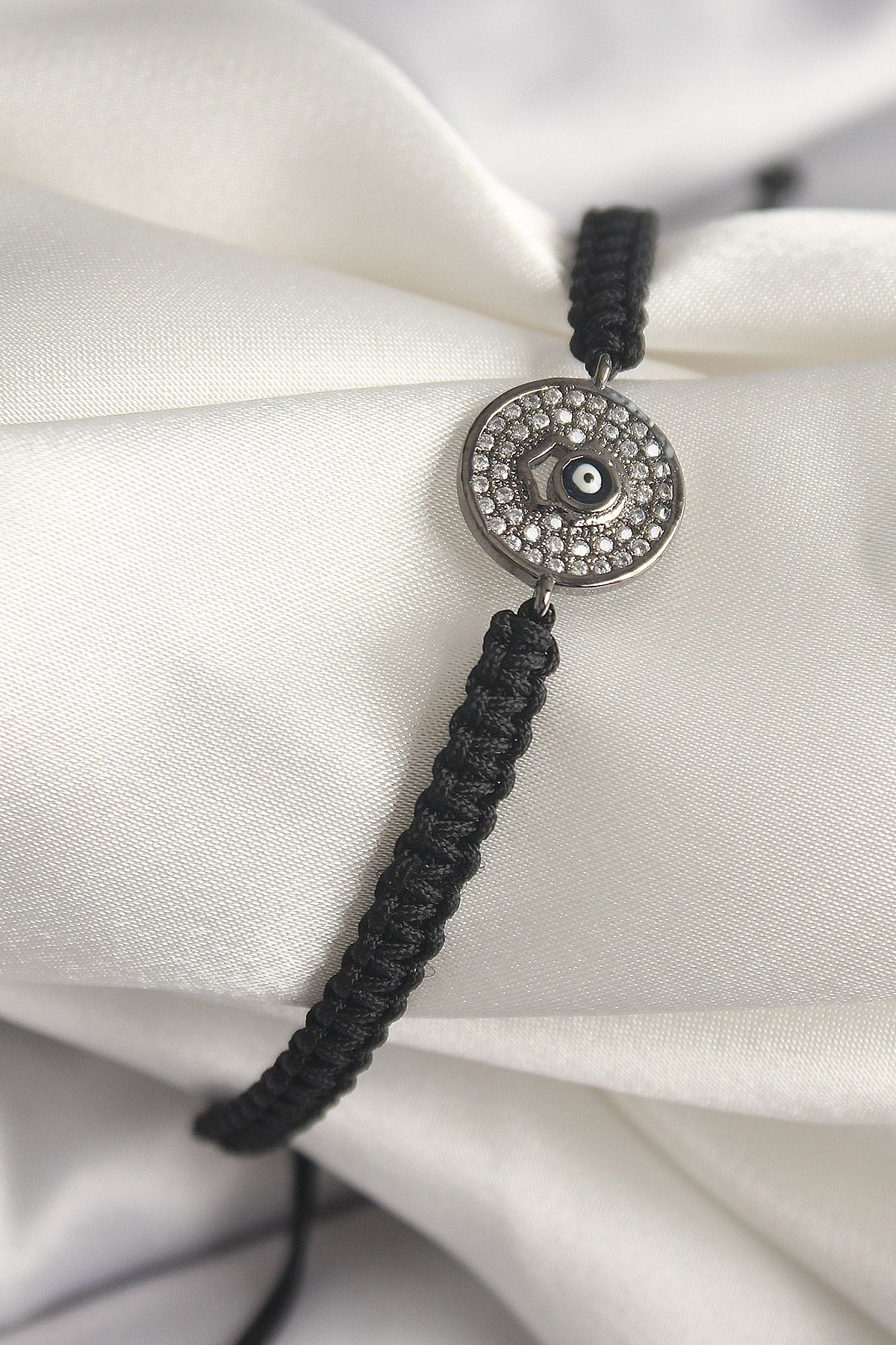YRTCL Pirinç Füme Renk Zirkon Taşlı Nazar Boncuk İşleme Makrome Asansörlü Model Kadın Bileklik