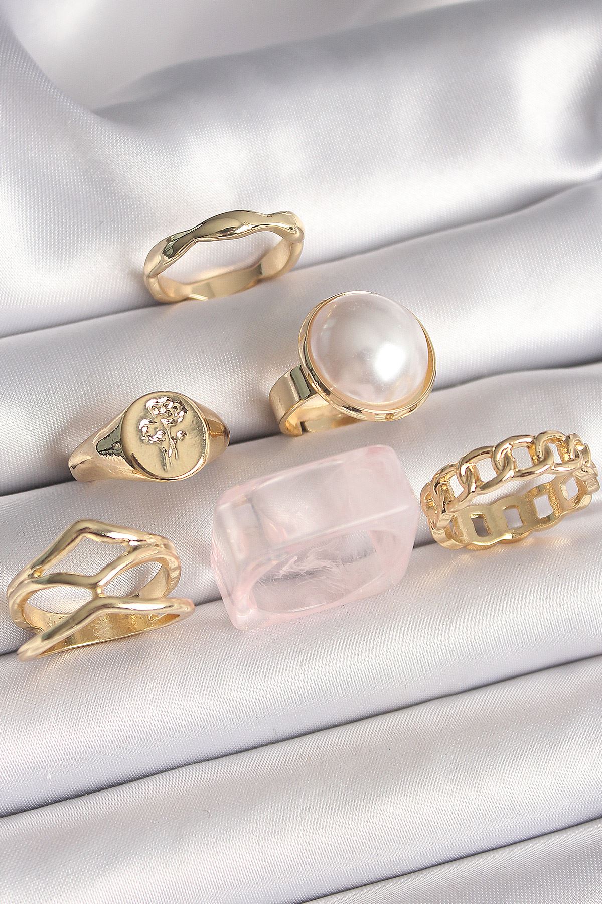 YRTCL Pirinç Gold Renk Beyaz İncili Zincir Yüzük Figür İşleme Detay 6'Lı Kadın Yüzük Seti