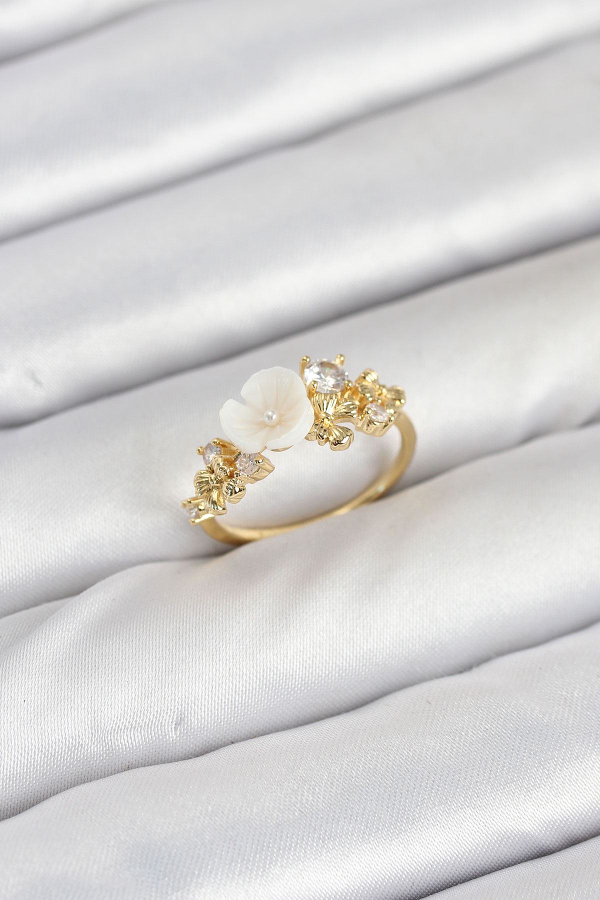 YRTCL Pirinç Gold Renk Zirkon Taşlı Fiyonk İnci Detay Ayarlanabilir Yüzük