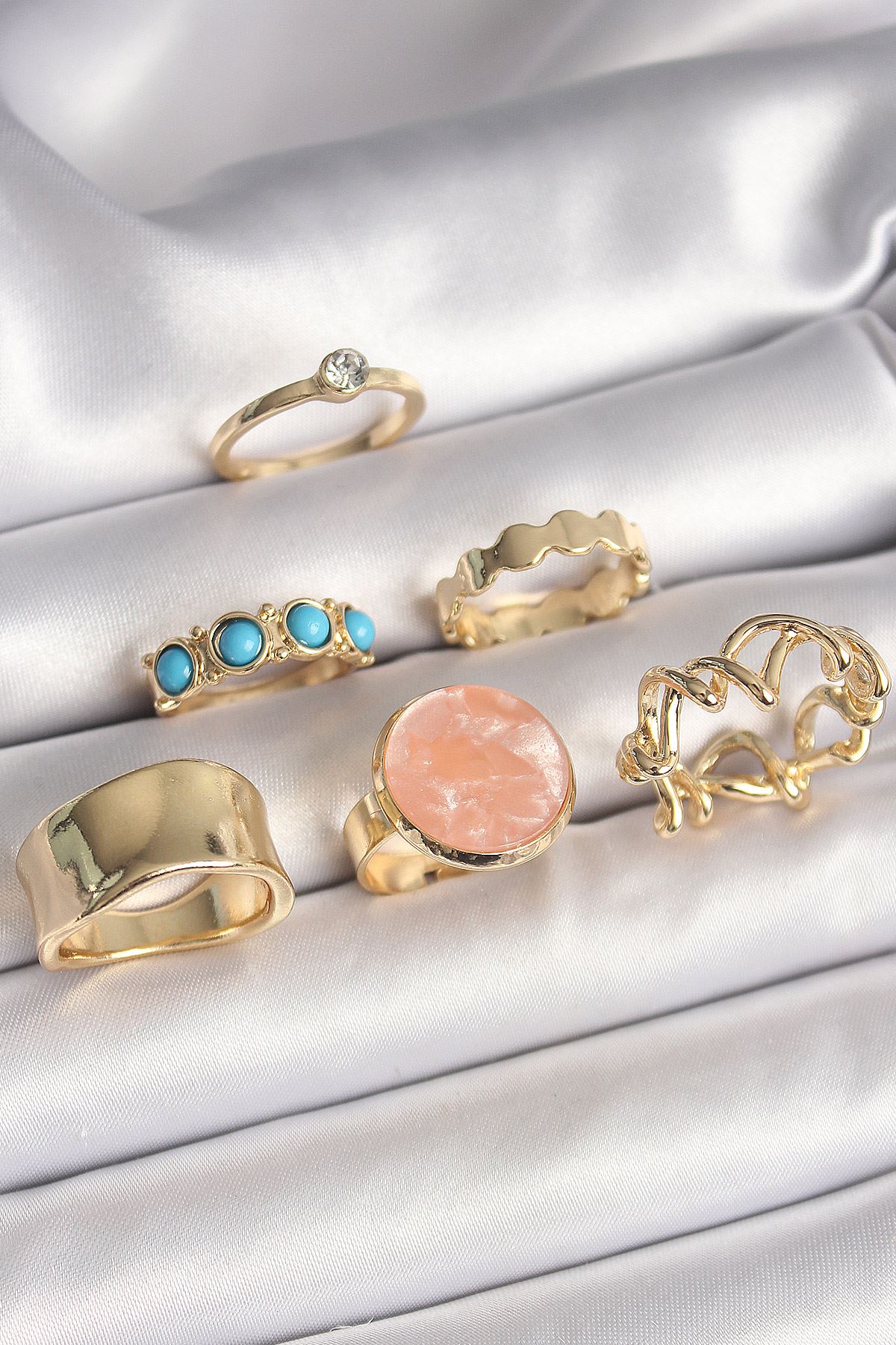 YRTCL Pirinç Gold Renk Daire Pembe Mineli Zirkon Taş Detaylı 6'Lı Kadın Yüzük Seti