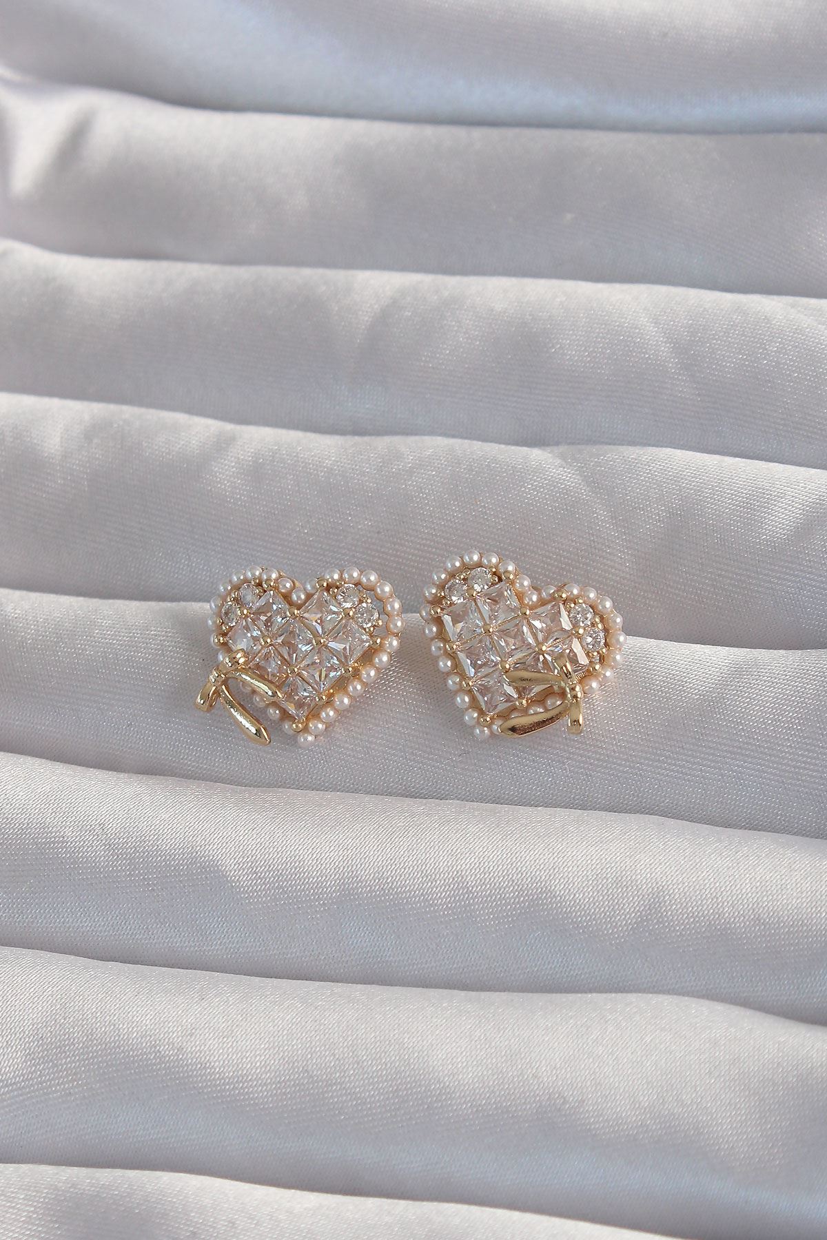 YRTCL Pirinç Gold Renk Fiyonk Detay İncili Zirkon Taşlı Kalp Küpe