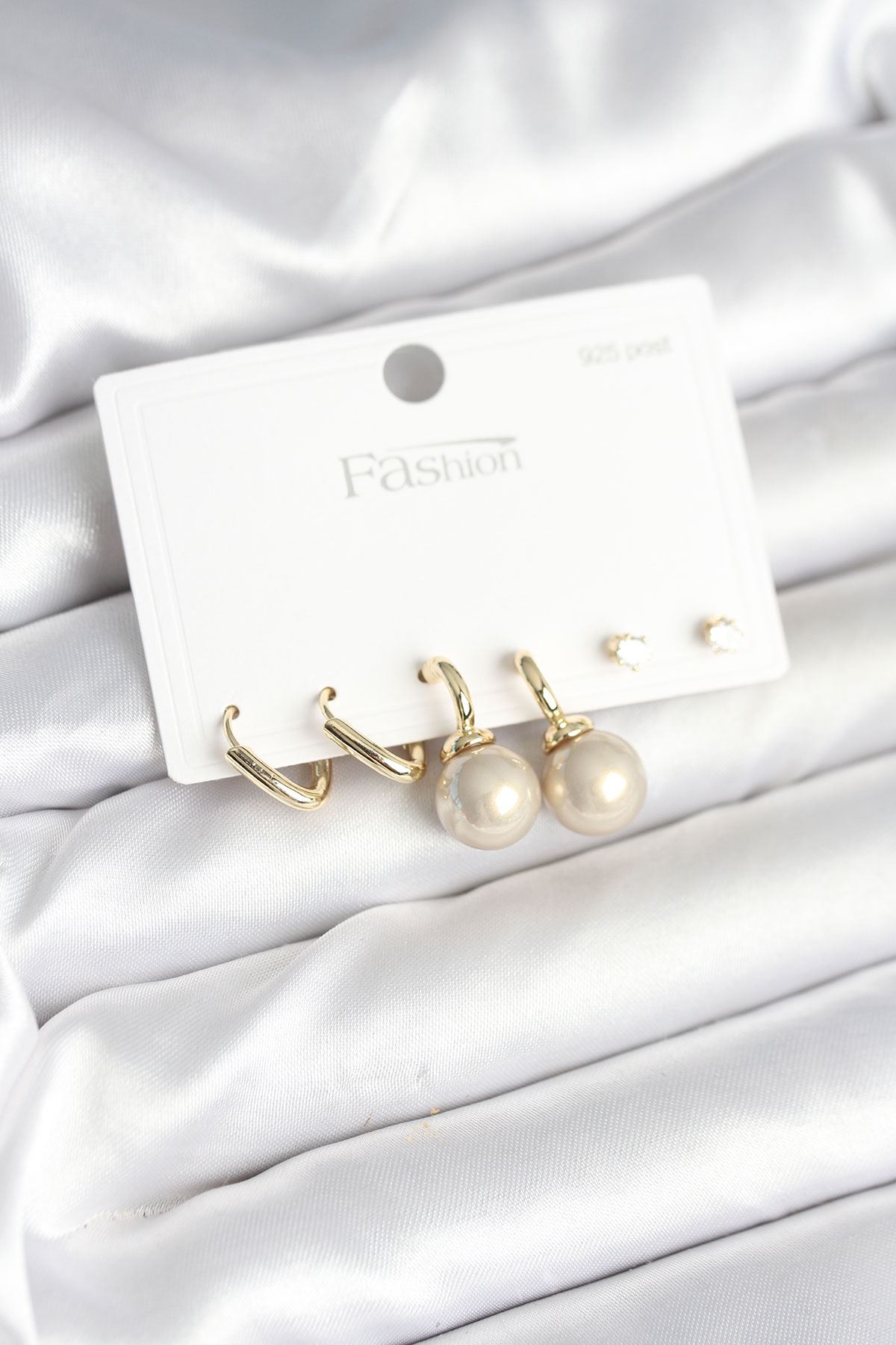 YRTCL Pirinç Gold Renk İnci Detaylı 925 Gümüş Çivili Kadın Küpe Seti