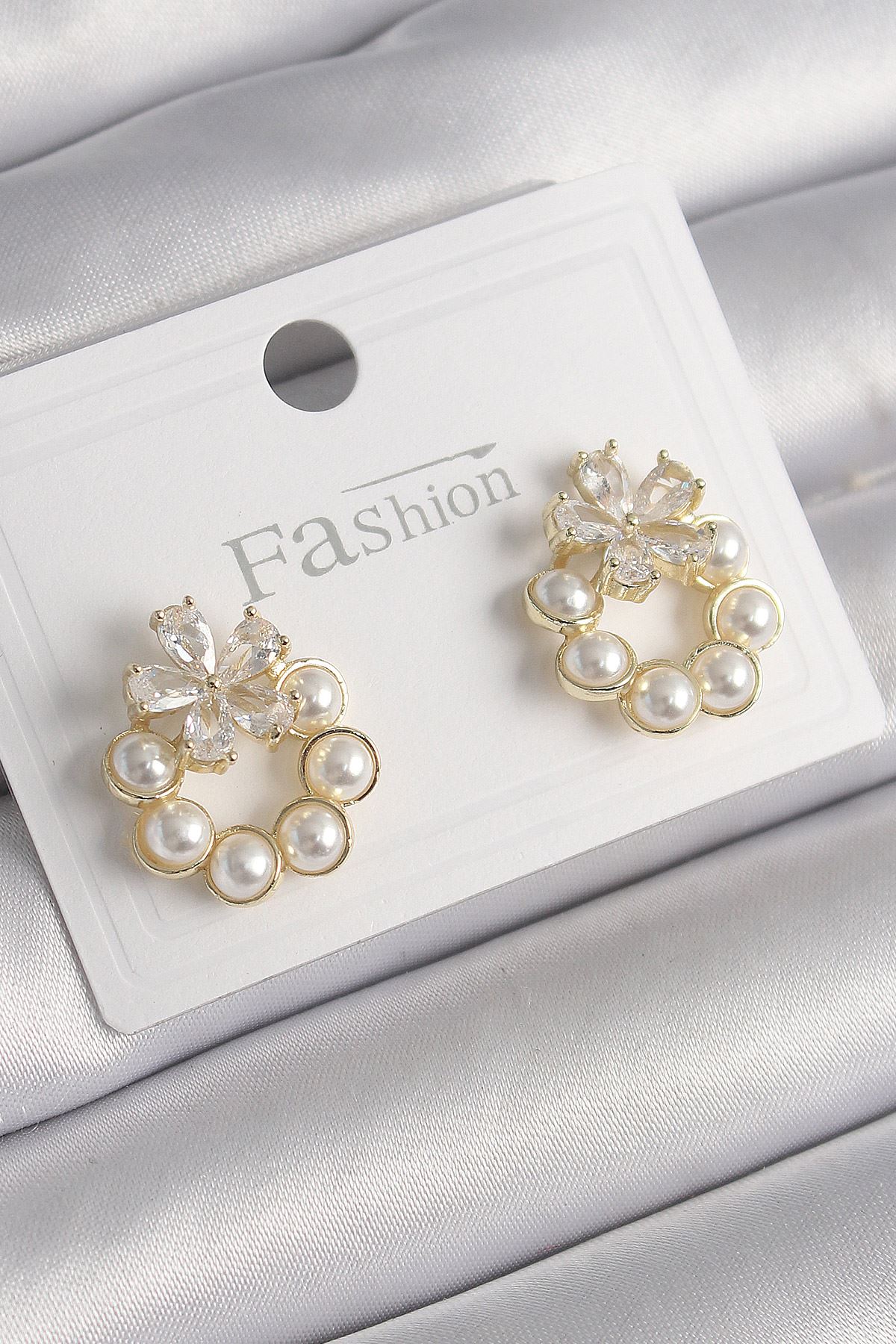 YRTCL Pirinç Gold Renk İncili Halka Model Zirkon Taşlı Kelebek Model Kadın Küpe