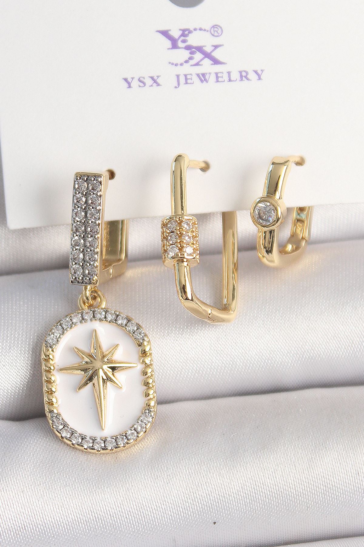 YRTCL Pirinç Gold Renk Sallantı Zirkon Taş İşlmeli Yıldız Portre Model 3'Lü Kadın Kombin Küpe