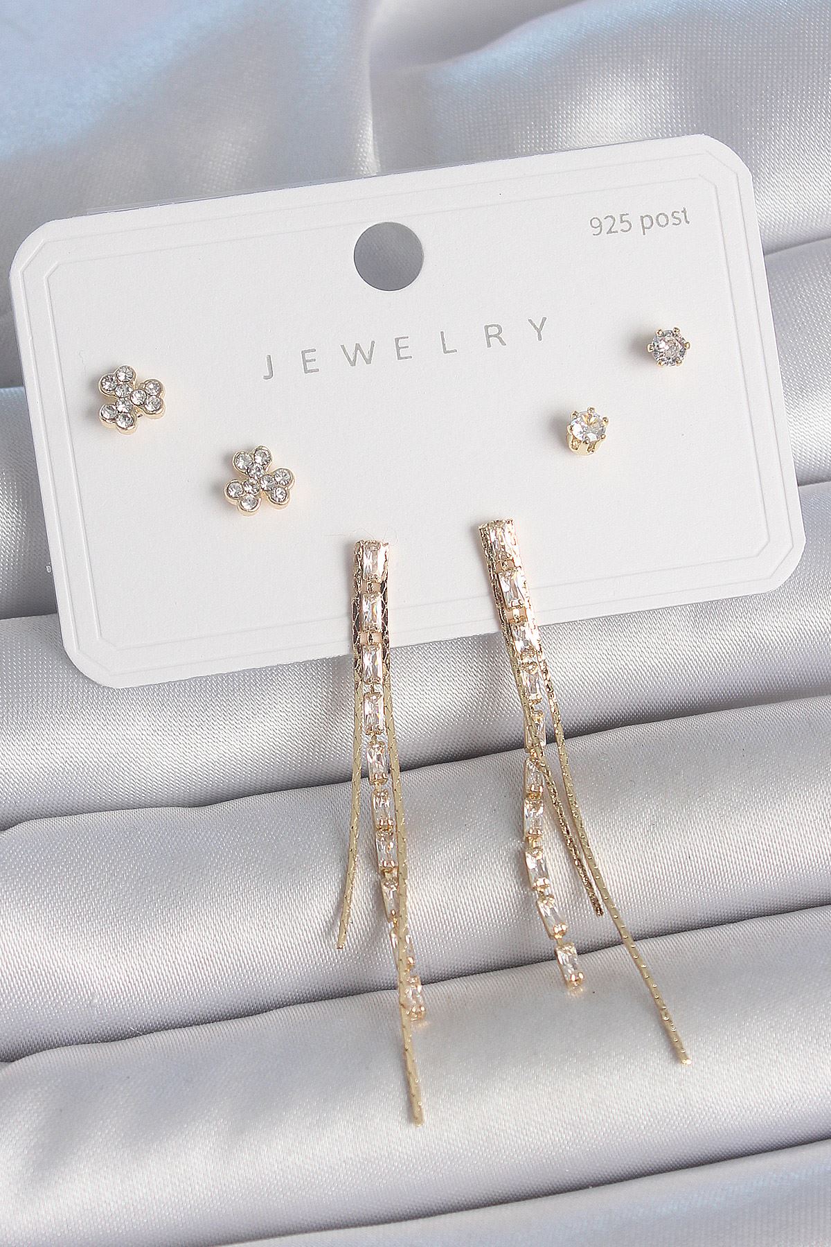 YRTCL Pirinç Gold Renk Su Yolu Zirkon Taşlı Sallantı Model Çiçek Detay 925 Ayar Gümüş Çivi Kadın Küpe Seti
