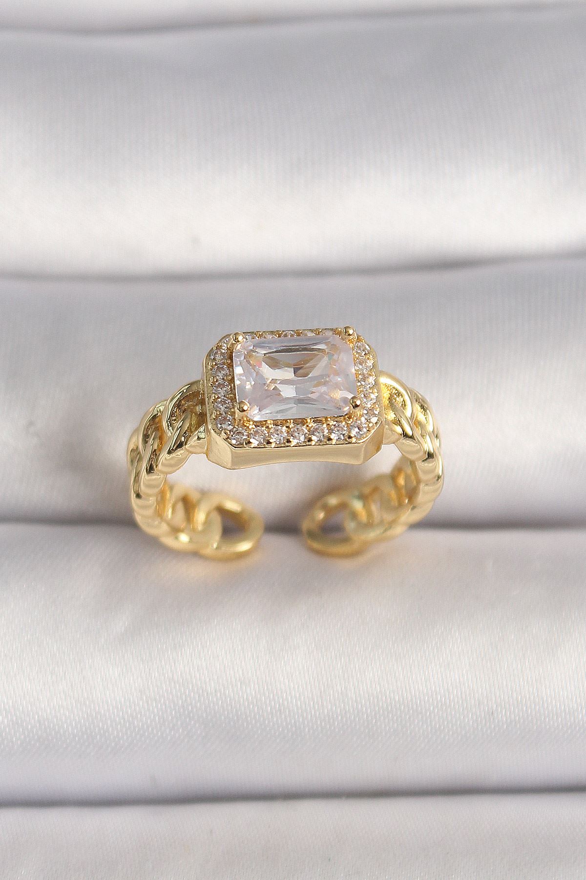 YRTCL Pirinç Gold Renk Zincir Model Kare Zirkon Taşlı Kadın Yüzük