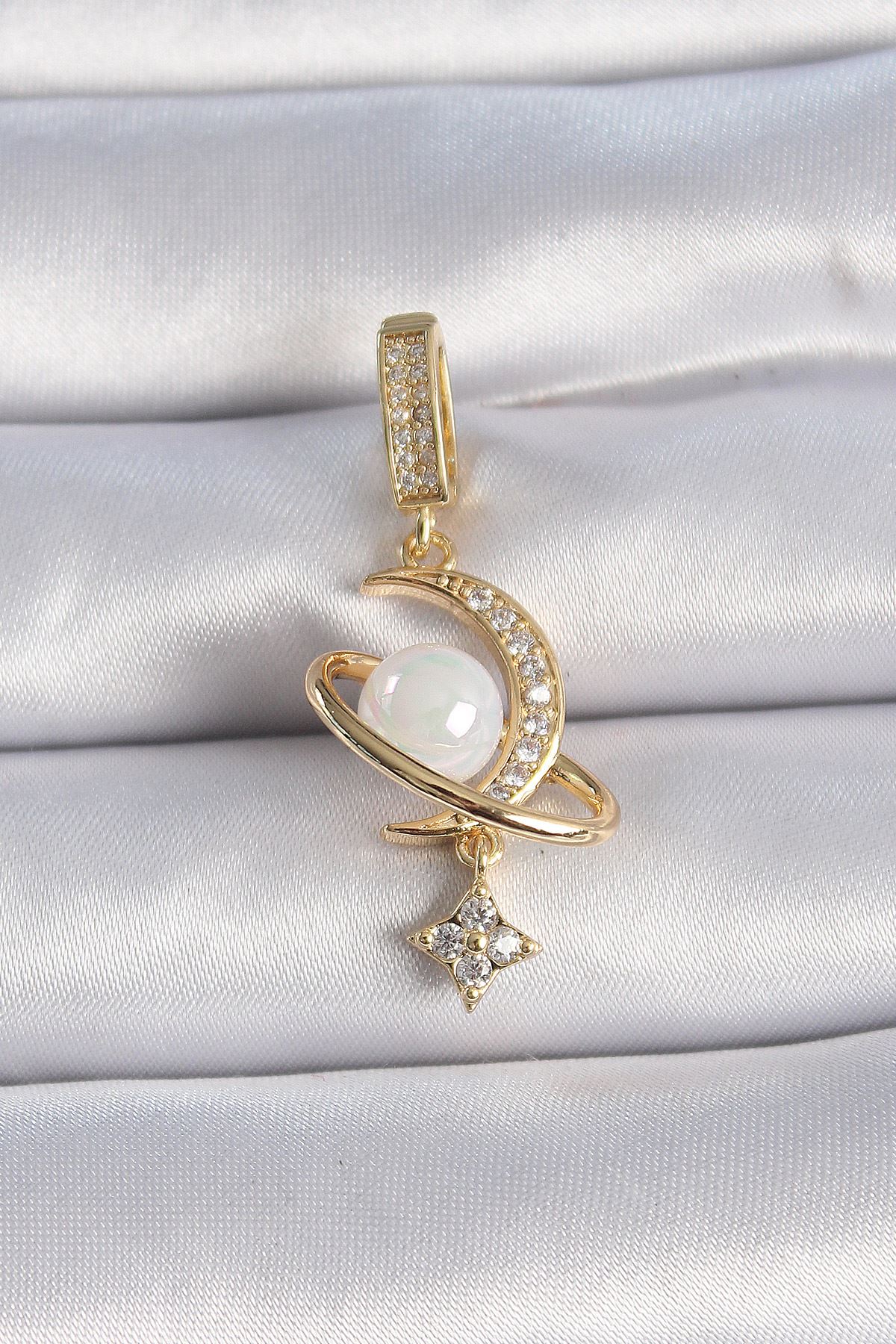 YRTCL Pirinç Gold Renk Zirkon Taş Detaylı Hilal Model Sallantı İncili Ajda Charm