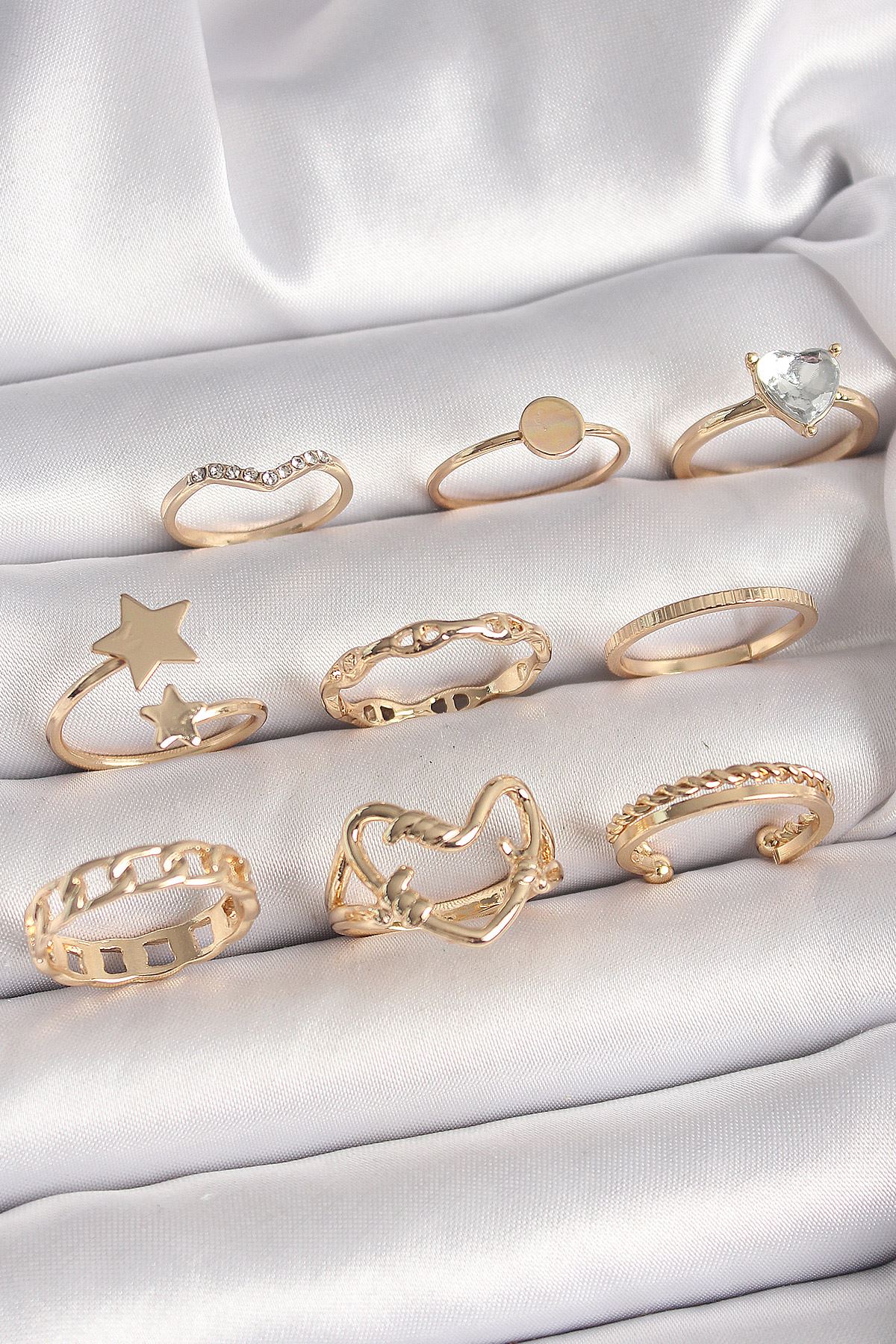 YRTCL Pirinç Gold Renk Zirkon Taş Detaylı Kalp Yıldız Figür Kadın Yüzük Kombini