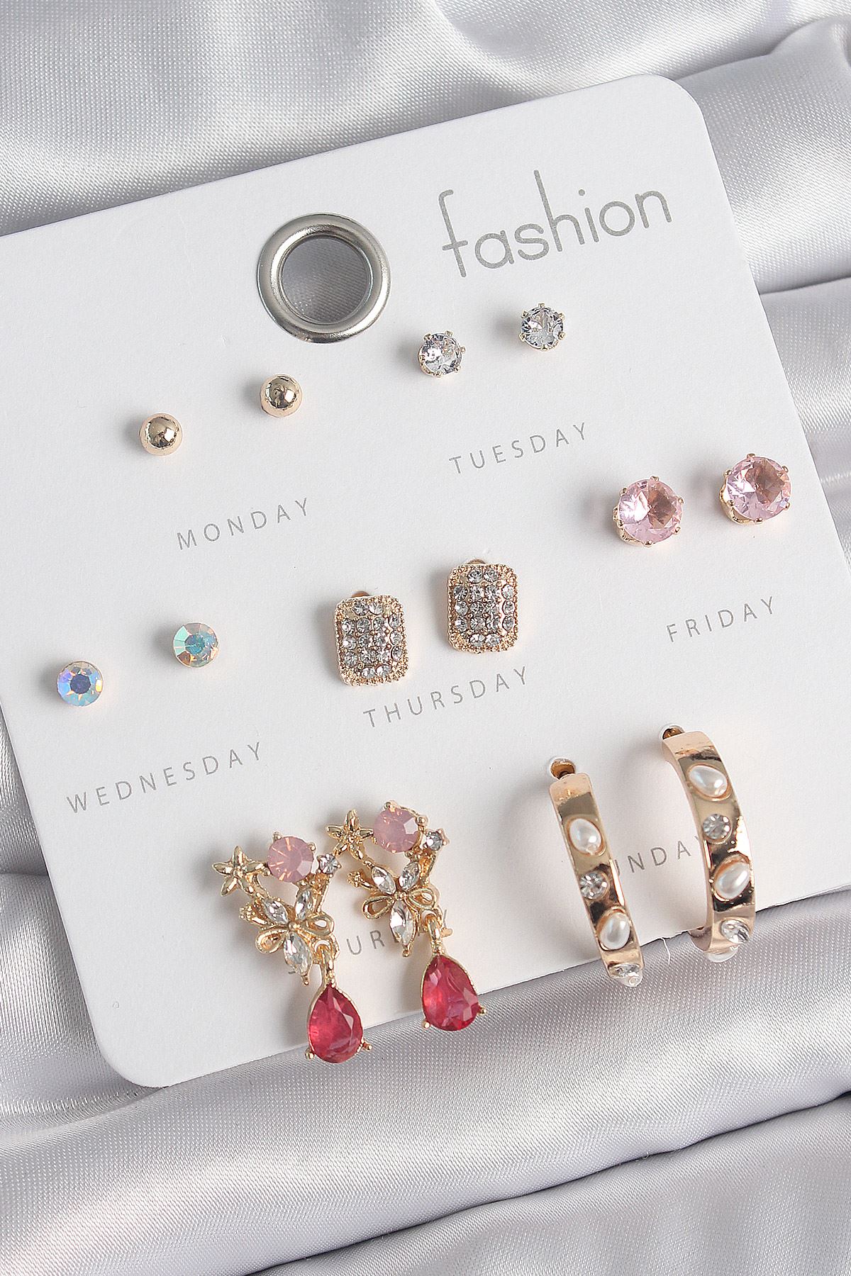 YRTCL Pirinç Gold Renk Zirkon Taşlı Çiçek Figür İncili Halka Figür 7 Çift Kadın Küpe Seti