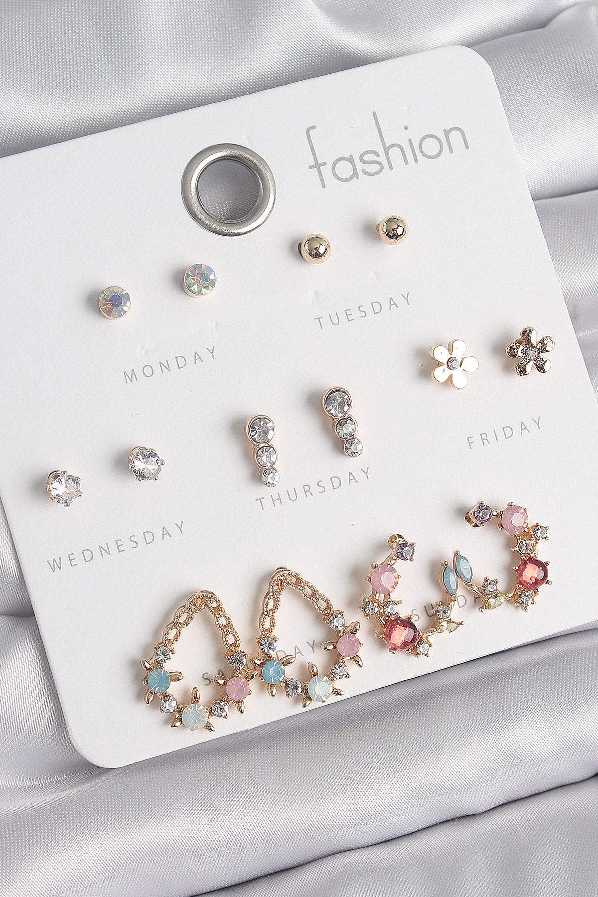 YRTCL Pirinç Gold Renk Zirkon Taşlı Sallantı Damla Figür Beyaz Mine Detay 7 Çift Kadın Küpe Seti