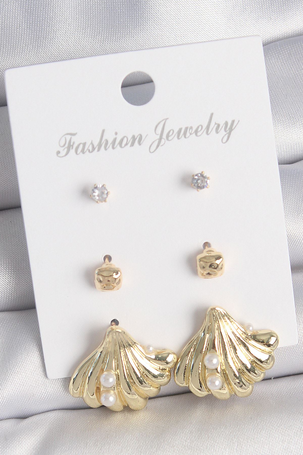 YRTCL Pirinç Gold Renk Zirkon Taşlı İnci Detaylı Deniz Kabuğu Model 3 Çift Kadın Küpe Seti