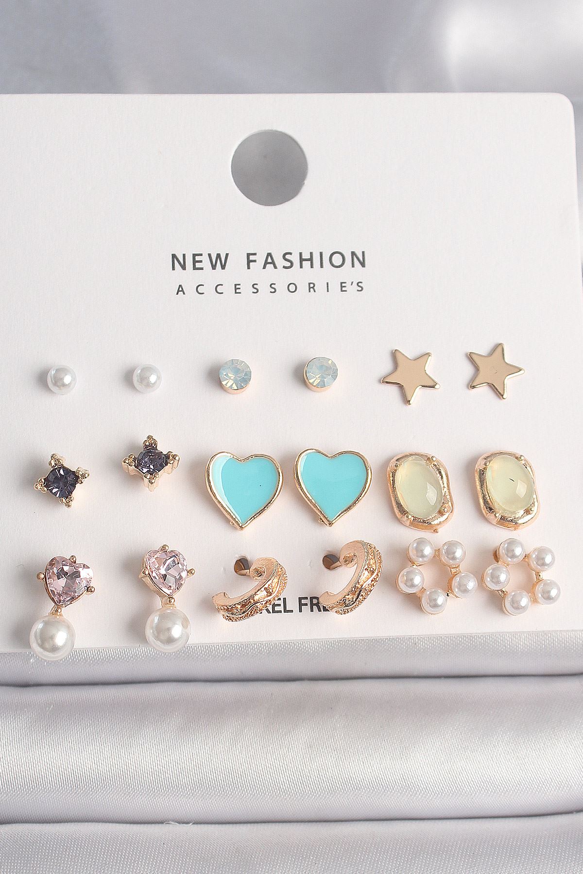 YRTCL Pirinç Gold Renk Zirkon Taşlı İncili Çiçek Mavi Kalp Figür 9 Çift Kadın Küpe Seti