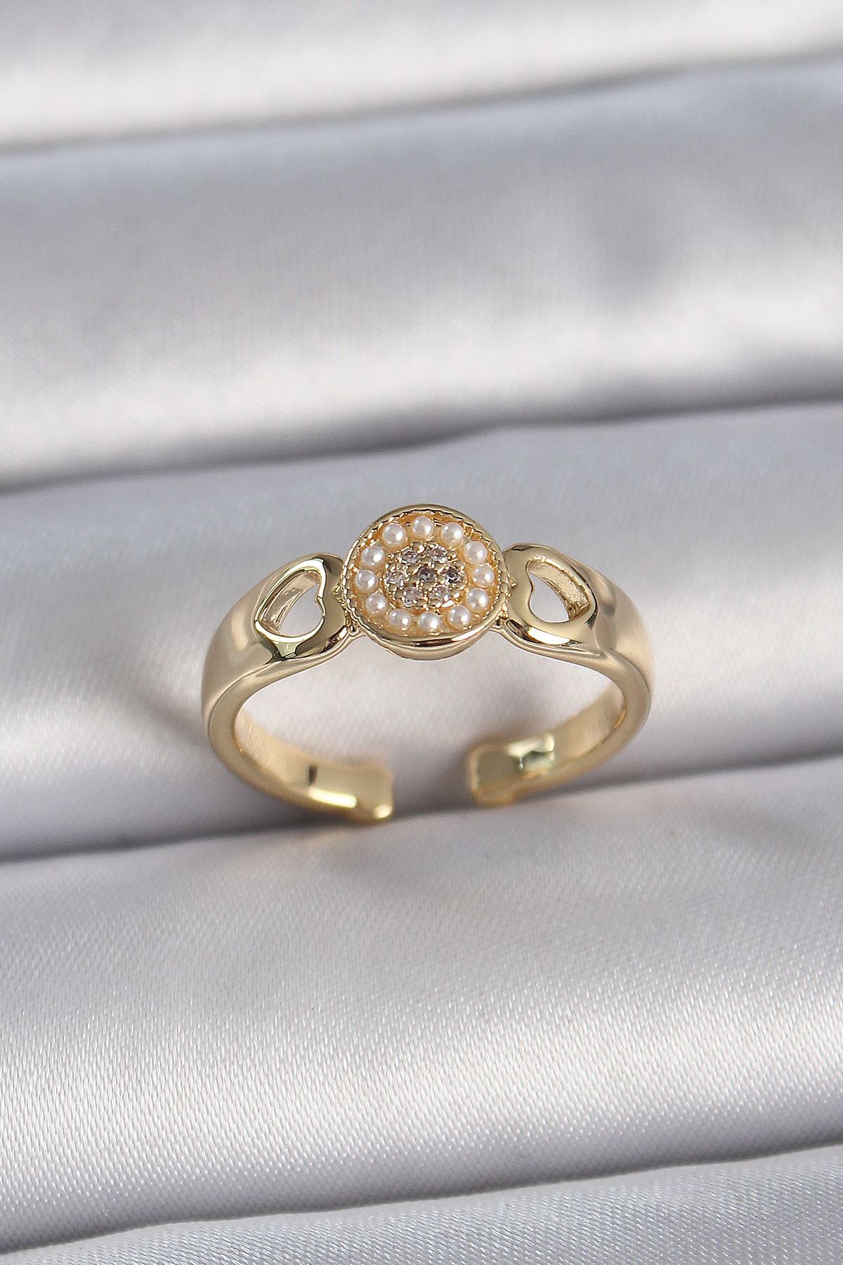 YRTCL Pirinç Gold Renk Zirkon Taşlı İncili Kalp İşleme Detay Ayarlanabilir Kadın Yüzük