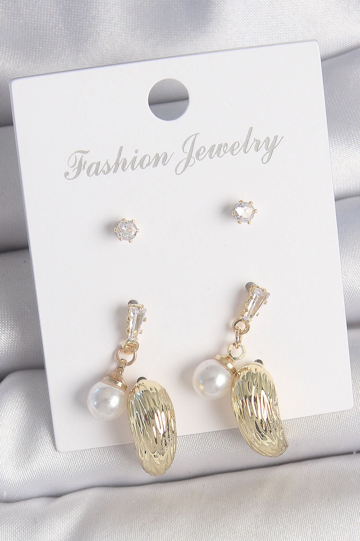 YRTCL Pirinç Gold Renk Zirkon Taşlı İncili Sallantılı İşlemeli Damla Model 3 Çift Kadın Küpe Seti