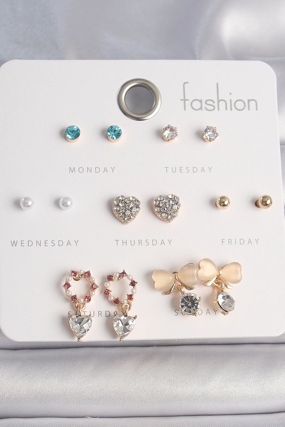 YRTCL Pirinç Gold Renk Zirkon Taşlı Kalp Beyaz Mineli Fiyonk Figür 7 Çift Kadın Küpe Seti