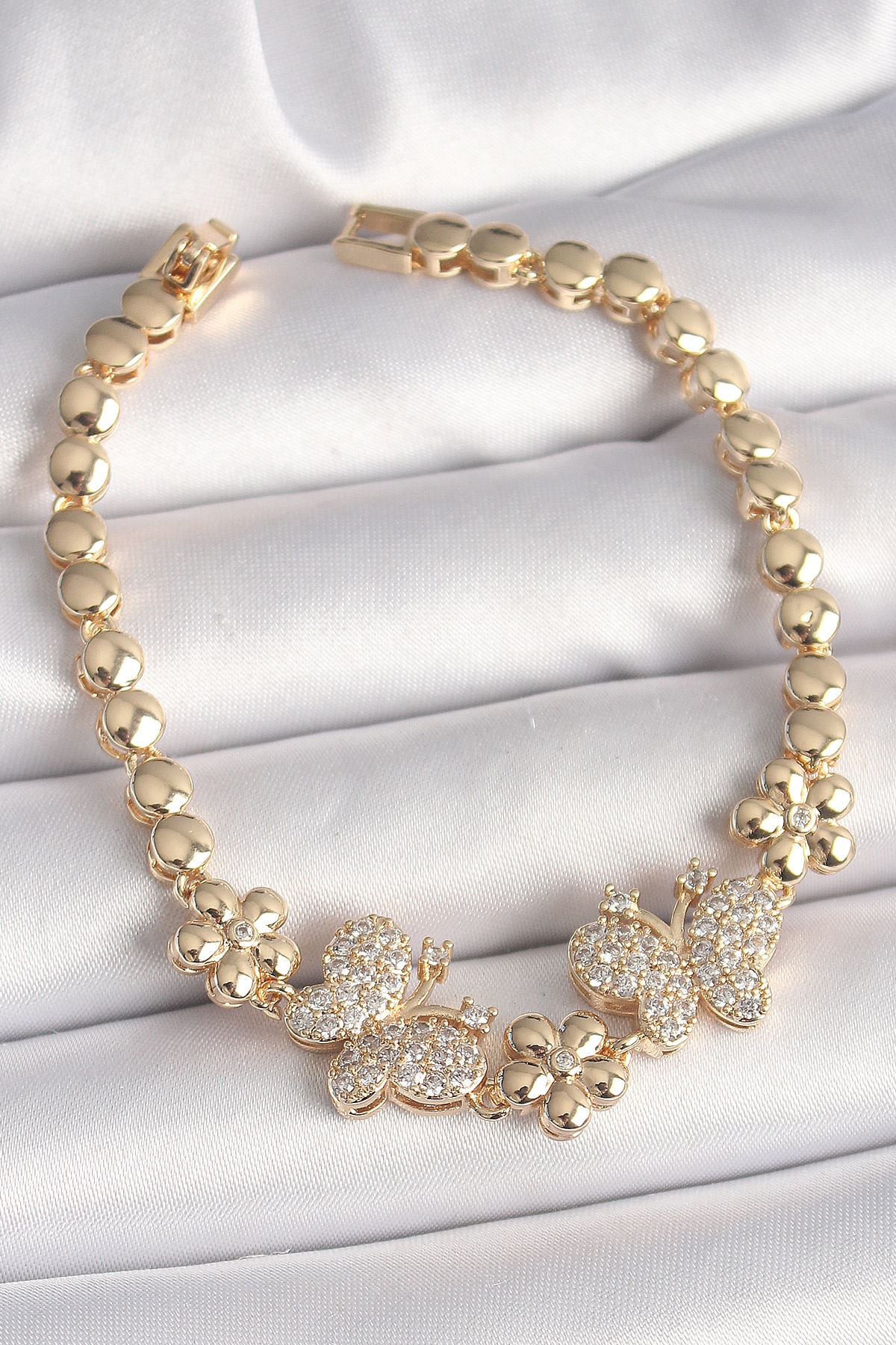 YRTCL Pirinç Gold Renk Zirkon Taşlı Kelebek Figür Çiçek Zincir Model Kadın Bileklik