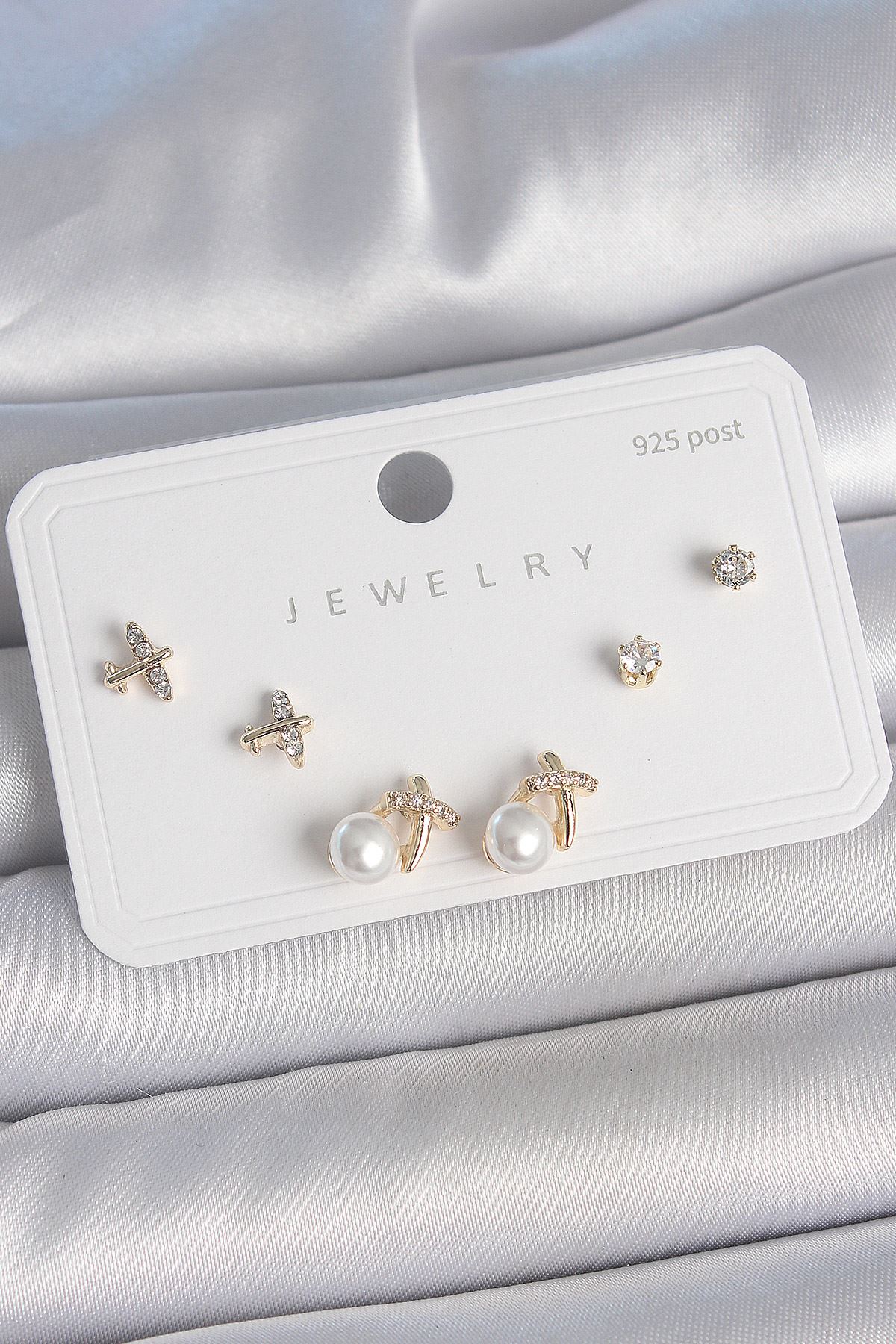 YRTCL Pirinç Gold Renk Zirkon Taşlı Kelebek Model İnci Detay 925 Ayar Gümüş Çivi Kadın Küpe Seti