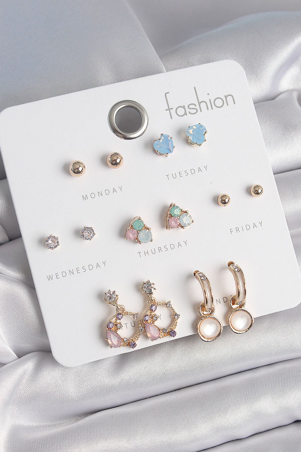 YRTCL Pirinç Gold Renk Zirkon Taşlı Sallantı Halka Figür Kalp Detay 7 Çift Kadın Küpe