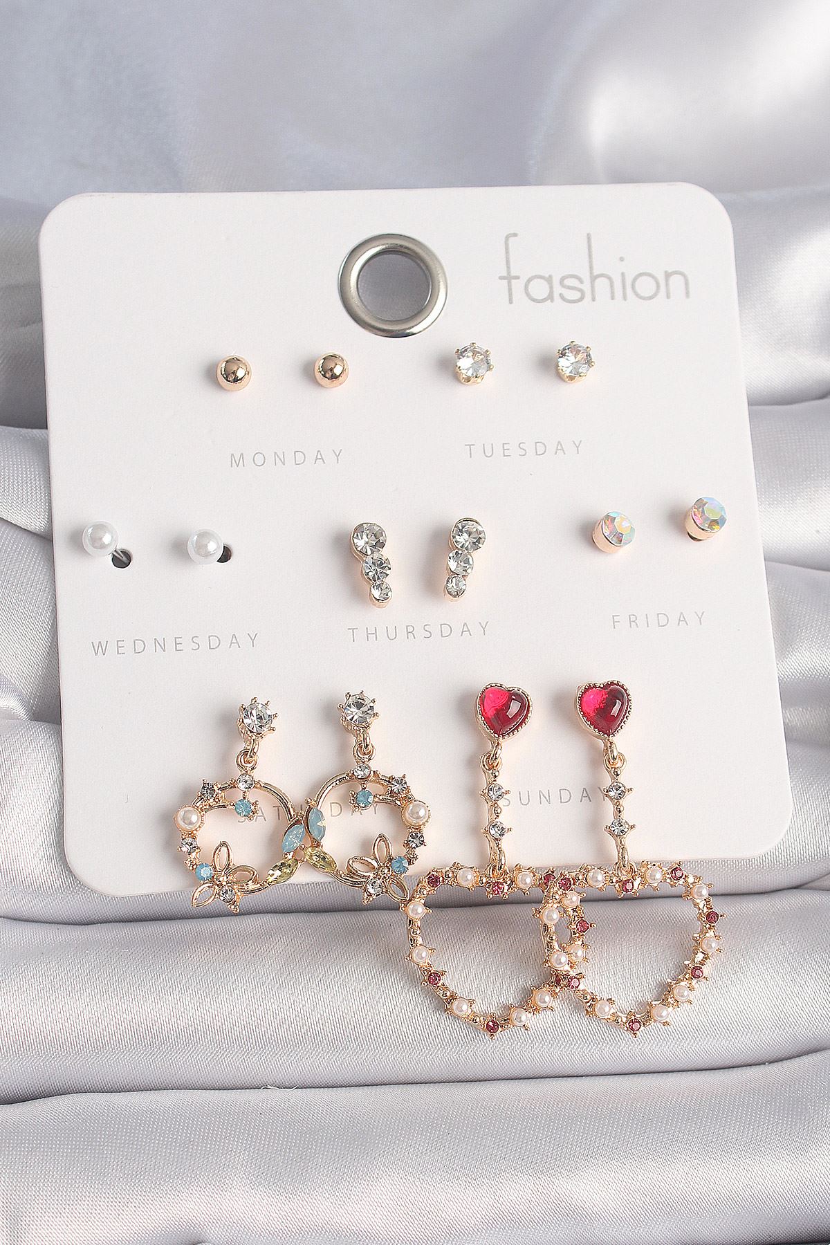 YRTCL Pirinç Gold Renk Zirkon Taşlı Sallantı Kalp Figür 7 Çift Kadın Küpe Seti