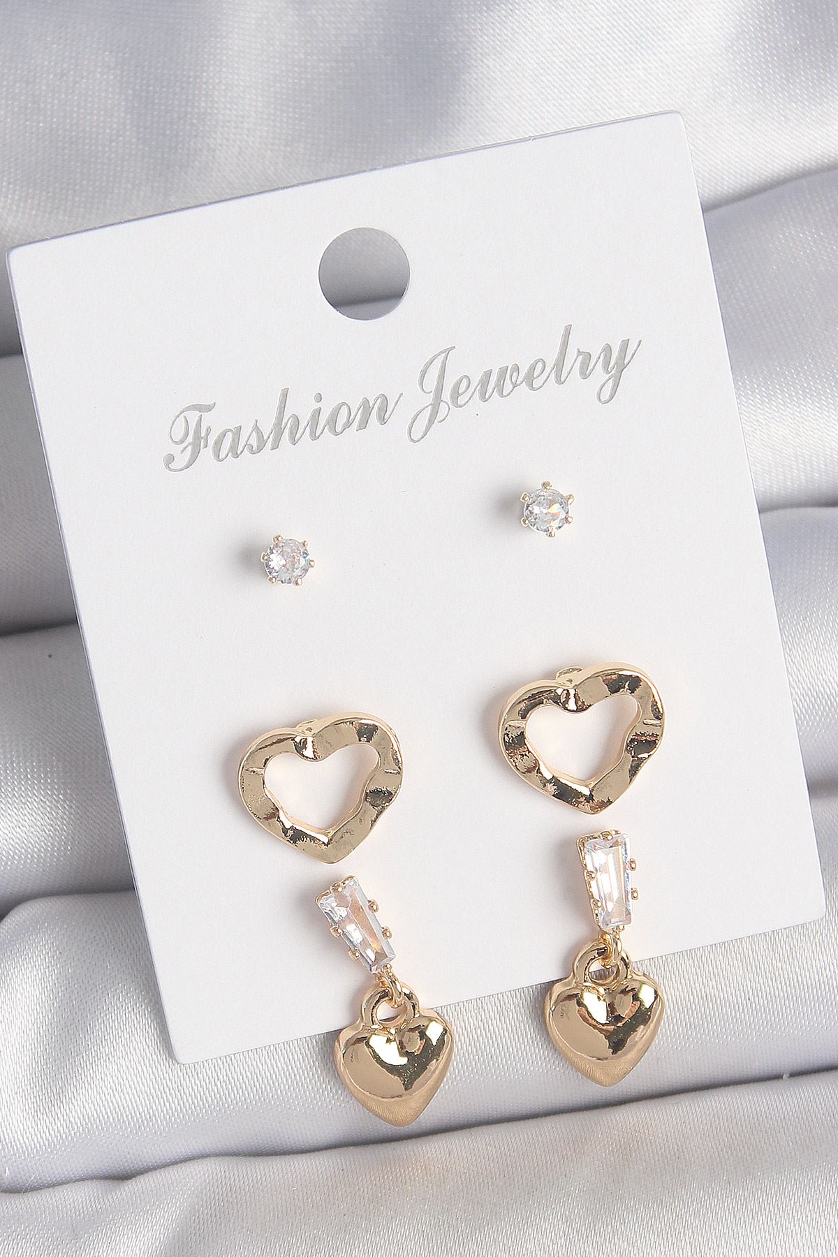 YRTCL Pirinç Gold Renk Zirkon Taşlı Sallantı Kalp Model Kadın 3 Çift Küpe Seti