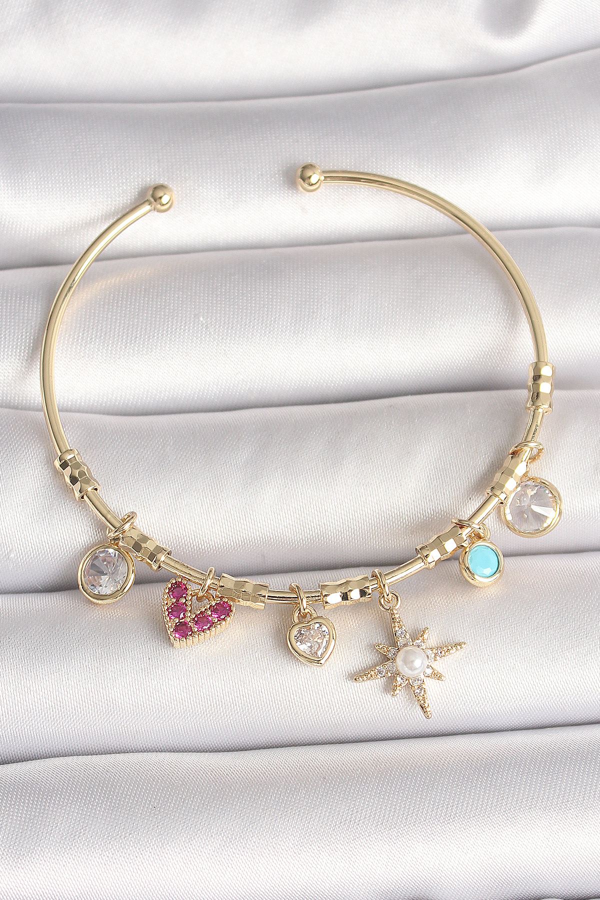 YRTCL Pirinç Gold Renk Zirkon Taşlı Sallantı Kutup Yıldız Figür İnci Detay Charm Kadın Bileklik
