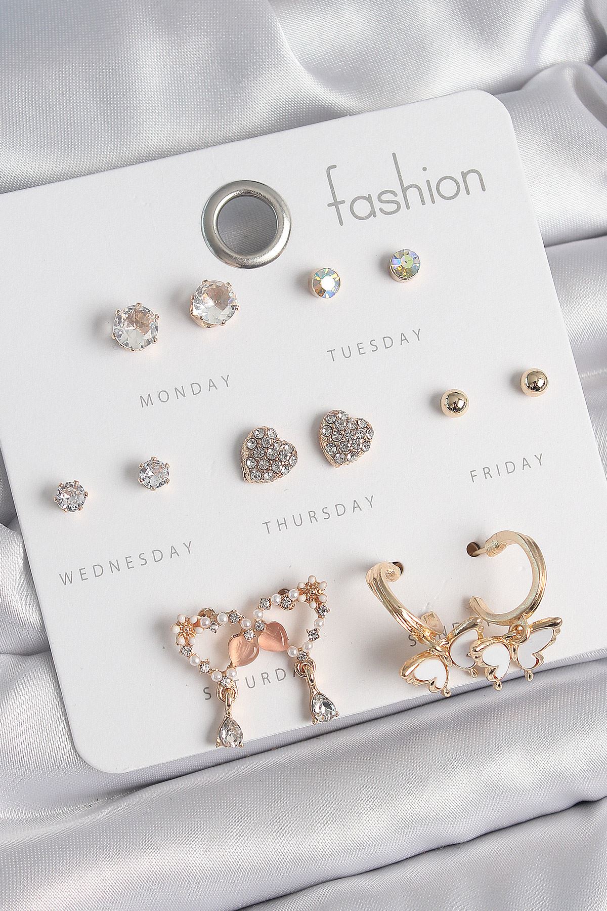 YRTCL Pirinç Gold Renk Zirkon Taşlı Sallantılı Kalp Figür Kelebek Detay 7 Çift Kadın Küpe Seti