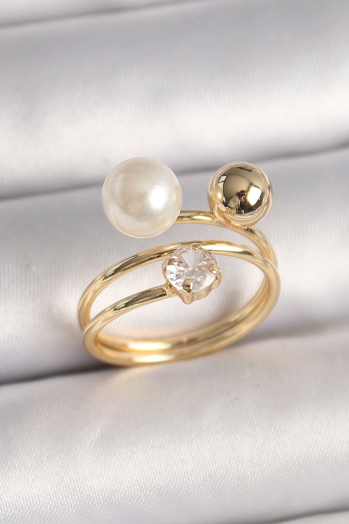 YRTCL Pirinç Gold Renk Zirkon Taşlı Top İnci Model Kadın Yüzük